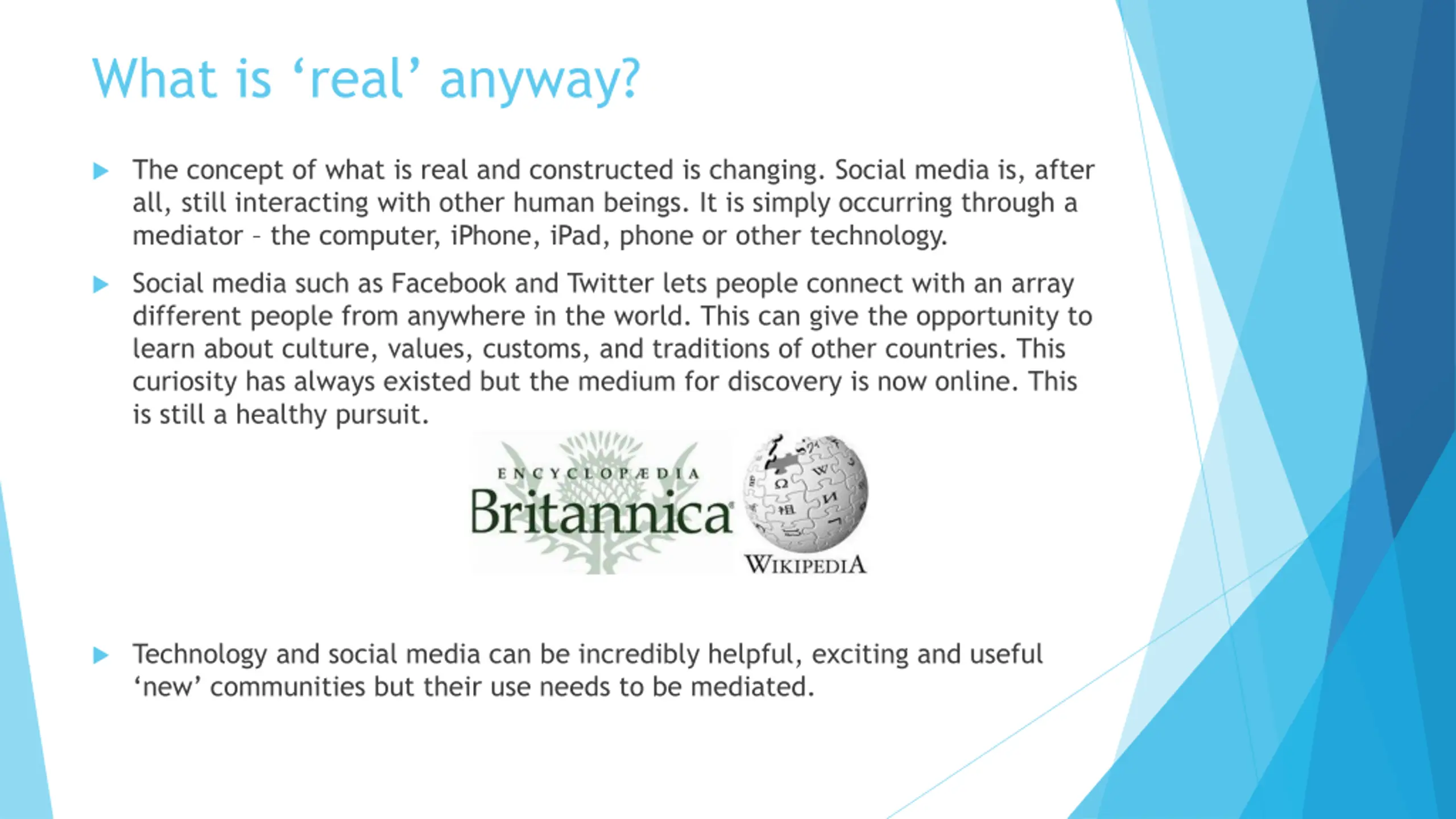 What is real anyway? The concept of what is real and constructed is changing. Social media is, after all, still interacting with other human beings. It is simply occurring through a mediator the computer, iPhone, iPad, phone or other technology. Social media such as Facebook and Twitter lets people connect with an array different people from anywhere in the world. This can give the opportunity to learn about culture, values, customs, and traditions of other countries. This curiosity has always existed but the medium for discovery is now online. This is still a healthy pursuit. Technology and social media can be incredibly helpful, exciting and useful new communities but their use needs to be mediated.
