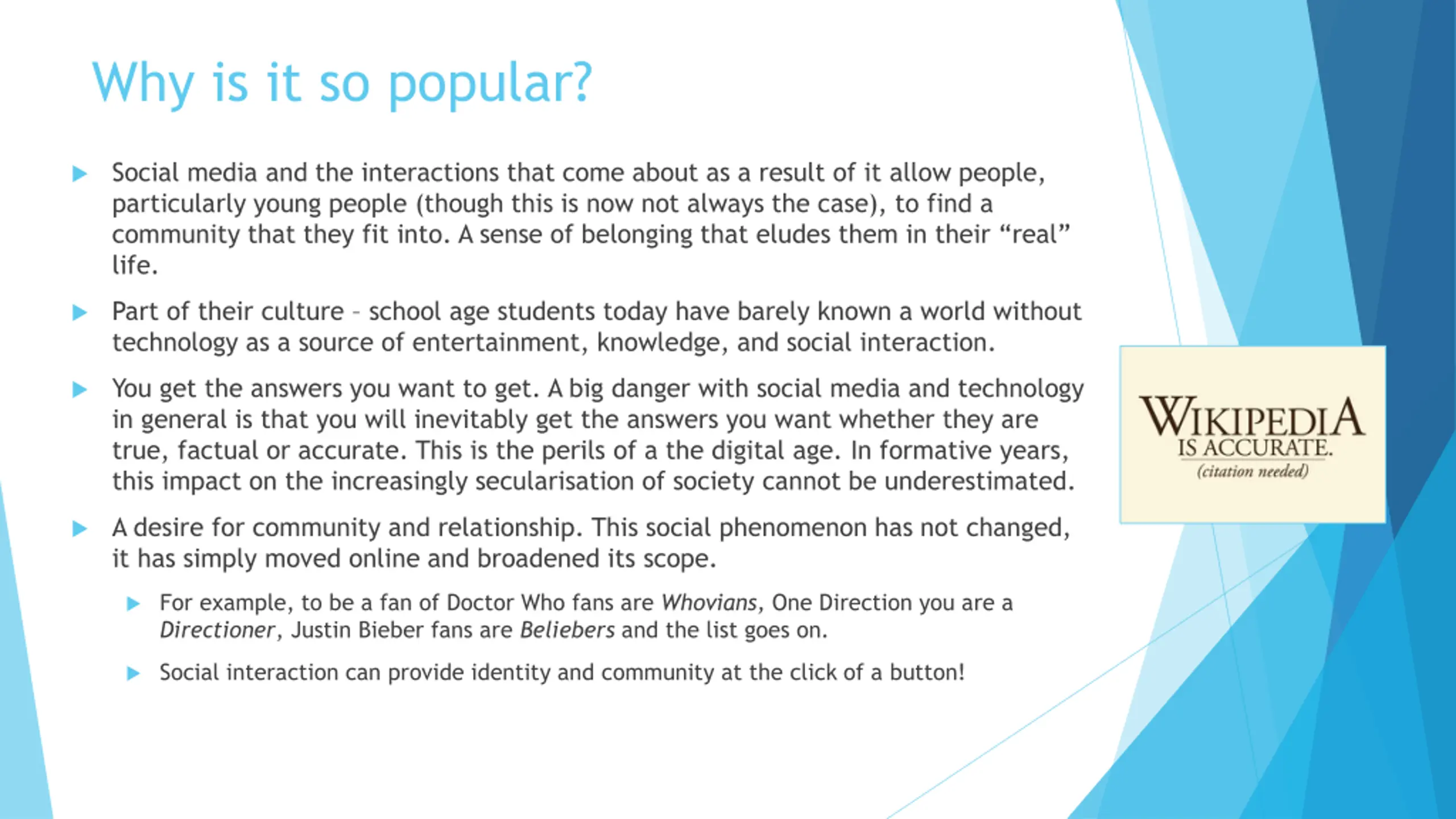 Why is it so popular? Social media and the interactions that come about as a result of it allow people, particularly young people (though this is now not always the case), to find a community that they fit into. A sense of belonging that eludes them in their real life. Part of their culture school age students today have barely known a world without technology as a source of entertainment, knowledge, and social interaction. You get the answers you want to get. A big danger with social media and technology in general is that you will inevitably get the answers you want whether they are true, factual or accurate. This is the perils of a the digital age. In formative years, this impact on the increasingly secularisation of society cannot be underestimated. A desire for community and relationship. This social phenomenon has not changed, it has simply moved online and broadened its scope. For example, to be a fan of Doctor Who fans are Whovians, One Direction you are a Directioner, Justin Bieber fans are Beliebers and the list goes on. Social interaction can provide identity and community at the click of a button!