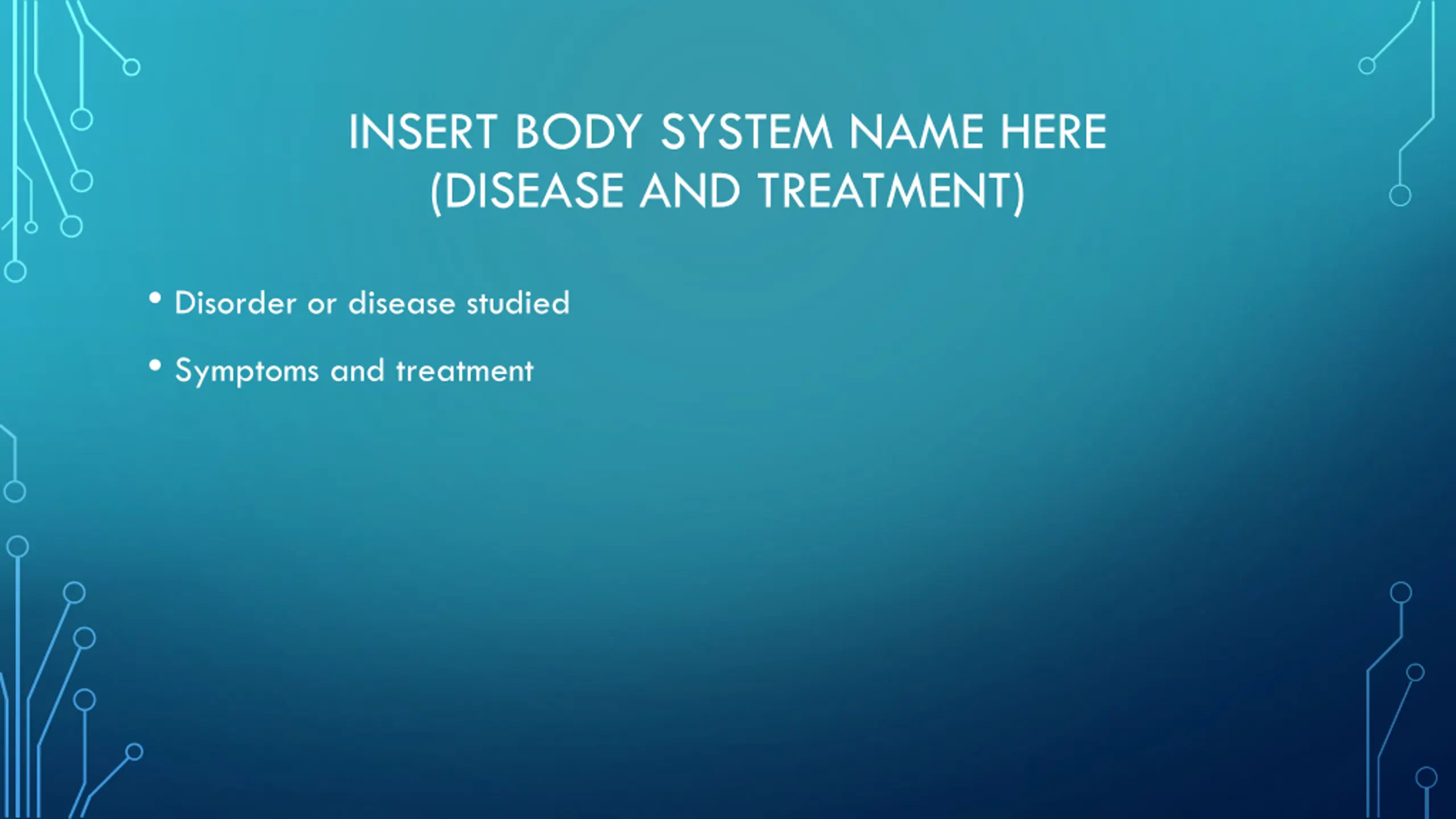 INSERT BODY SYSTEM NAME HERE (DISEASE AND TREATMENT) Disorder or disease studied Symptoms and treatment