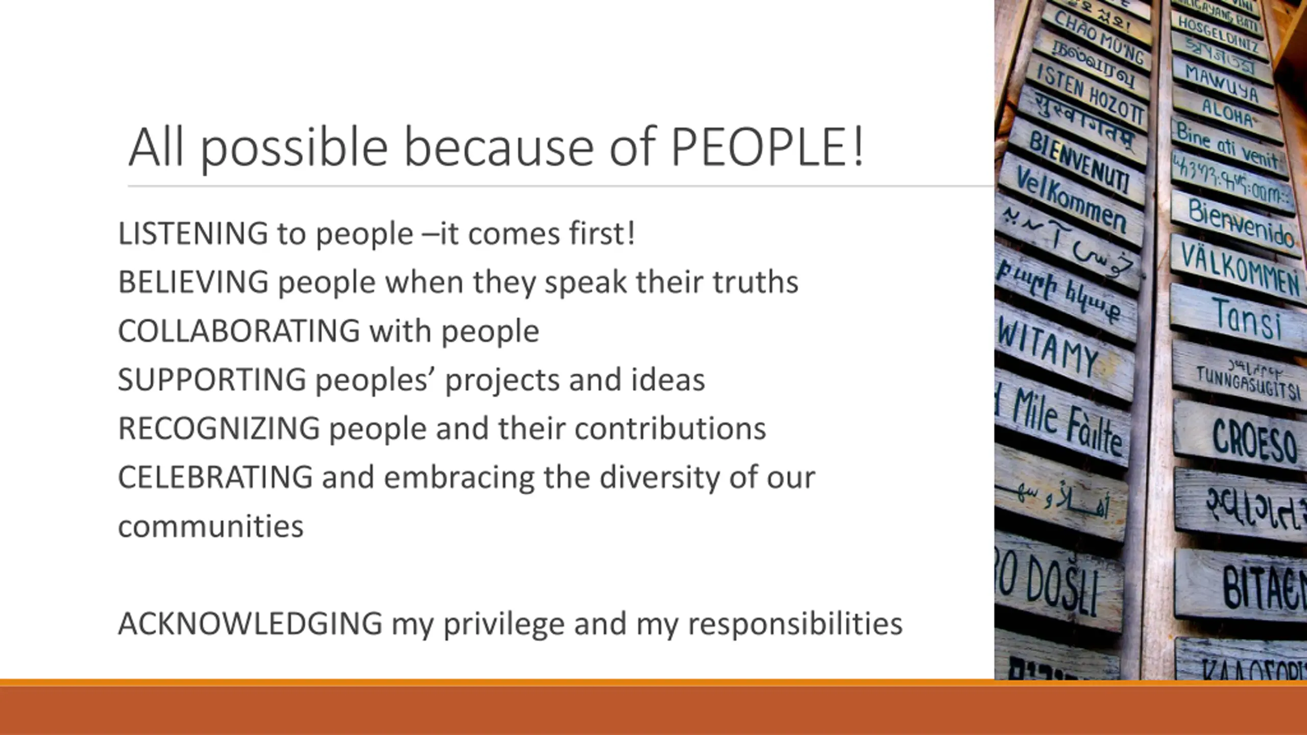 All possible because of PEOPLE! LISTENING to people it comes first! BELIEVING people when they speak their truths COLLABORATING with people SUPPORTING peoples projects and ideas RECOGNIZING people and their contributions CELEBRATING and embracing the diversity of our communities ACKNOWLEDGING my privilege and my responsibilities