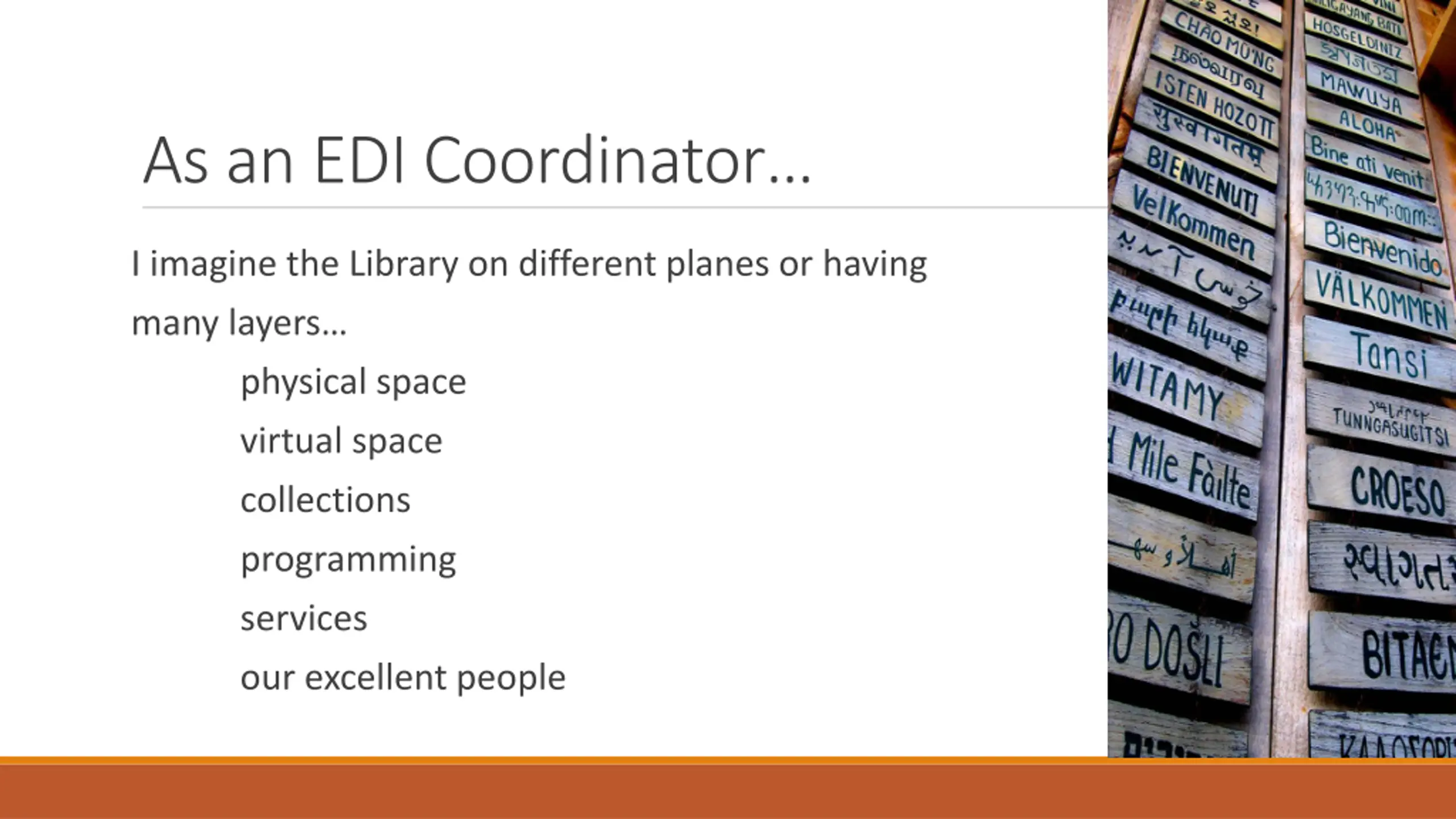 As an EDI Coordinator I imagine the Library on different planes or having many layers physical space virtual space collections programming services our excellent people