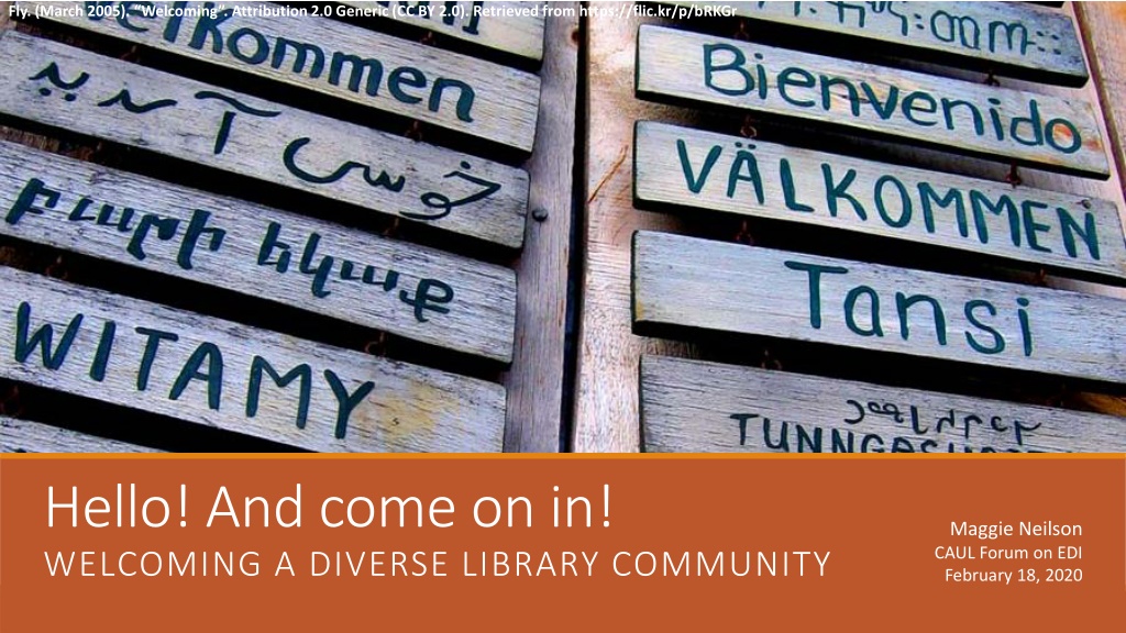 Fly. (March 2005). Welcoming. Attribution 2.0 Generic (CC BY 2.0). Retrieved from https://flic.kr/p/bRKGr Hello! And come on in! WELCOMING A DIVERSE LIBRARY COMMUNITY Maggie Neilson CAUL Forum on EDI February 18, 2020