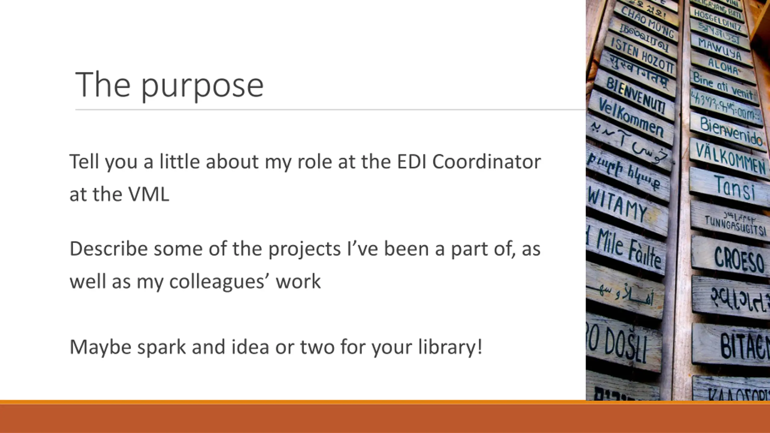 The purpose Tell you a little about my role at the EDI Coordinator at the VML Describe some of the projects I ve been a part of, as well as my colleagues work Maybe spark and idea or two for your library!