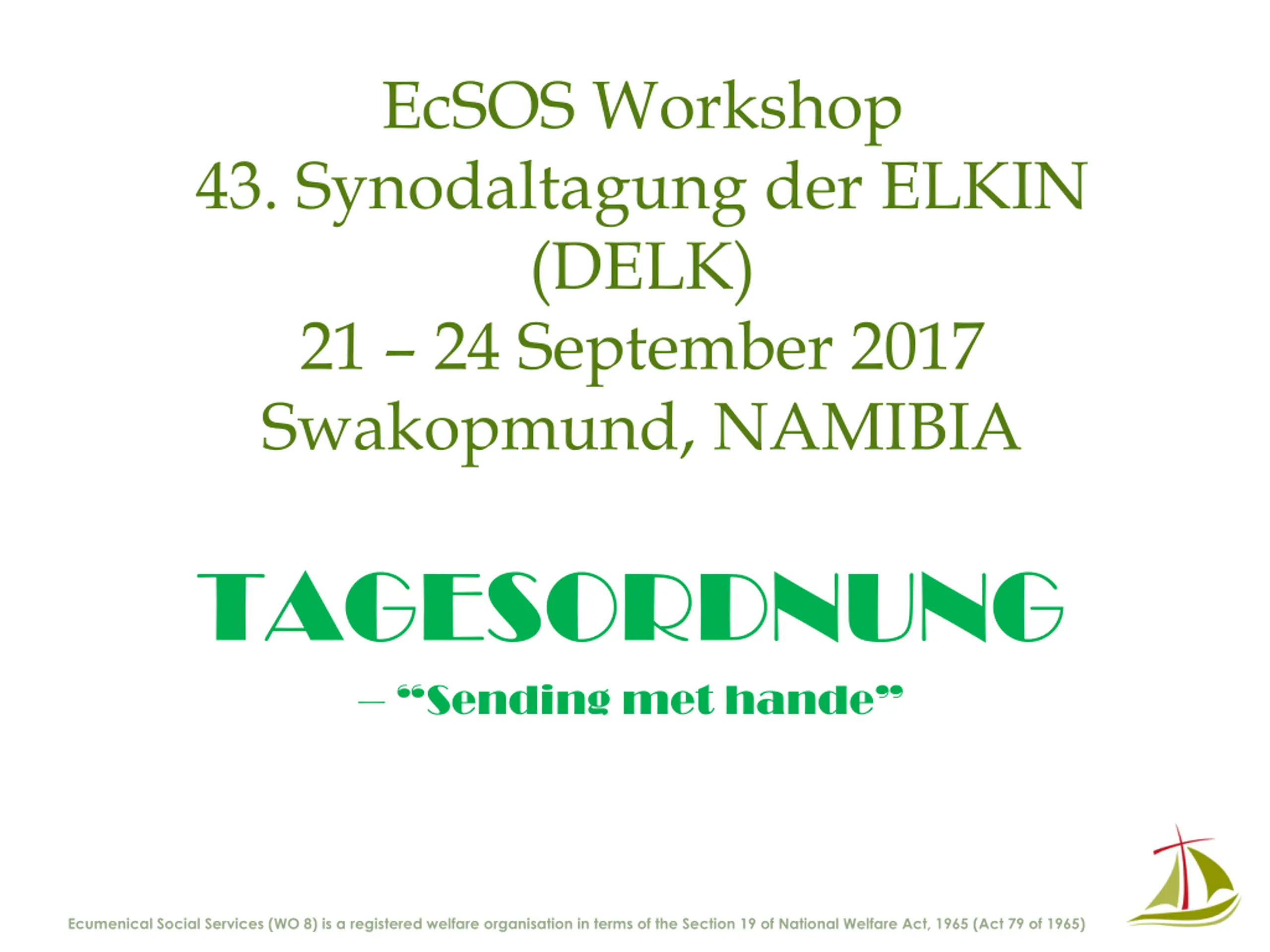 EcSOS Workshop 43. Synodaltagung der ELKIN (DELK) 21 24 September 2017 Swakopmund, NAMIBIA TAGESORDNUNG Sending met hande Ecumenical Social Services (WO 8) is a registered welfare organisation in terms of the Section 19 of National Welfare Act, 1965 (Act 79 of 1965)