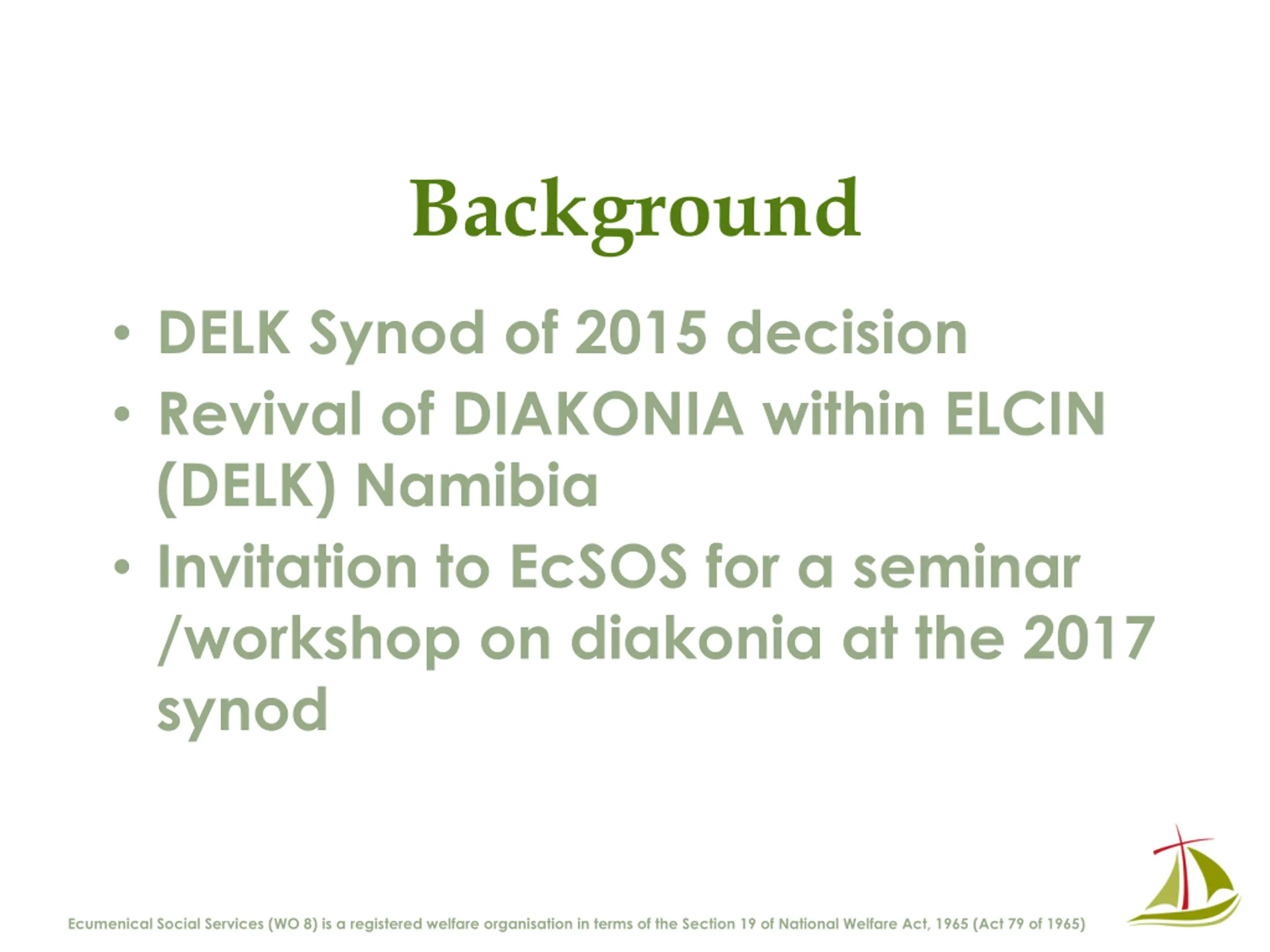 Background DELK Synod of 2015 decision Revival of DIAKONIA within ELCIN (DELK) Namibia Invitation to EcSOS for a seminar /workshop on diakonia at the 2017 synod Ecumenical Social Services (WO 8) is a registered welfare organisation in terms of the Section 19 of National Welfare Act, 1965 (Act 79 of 1965)