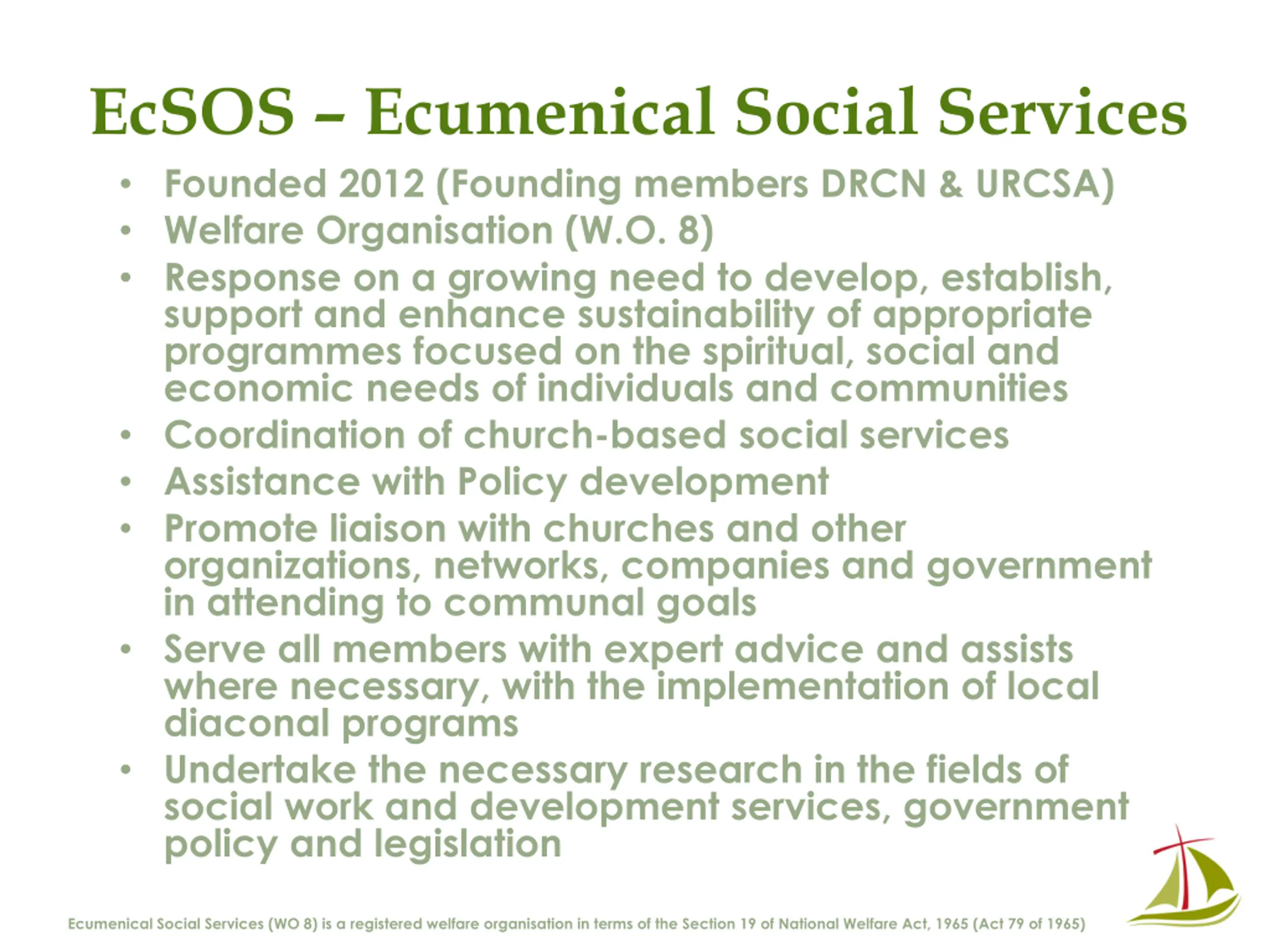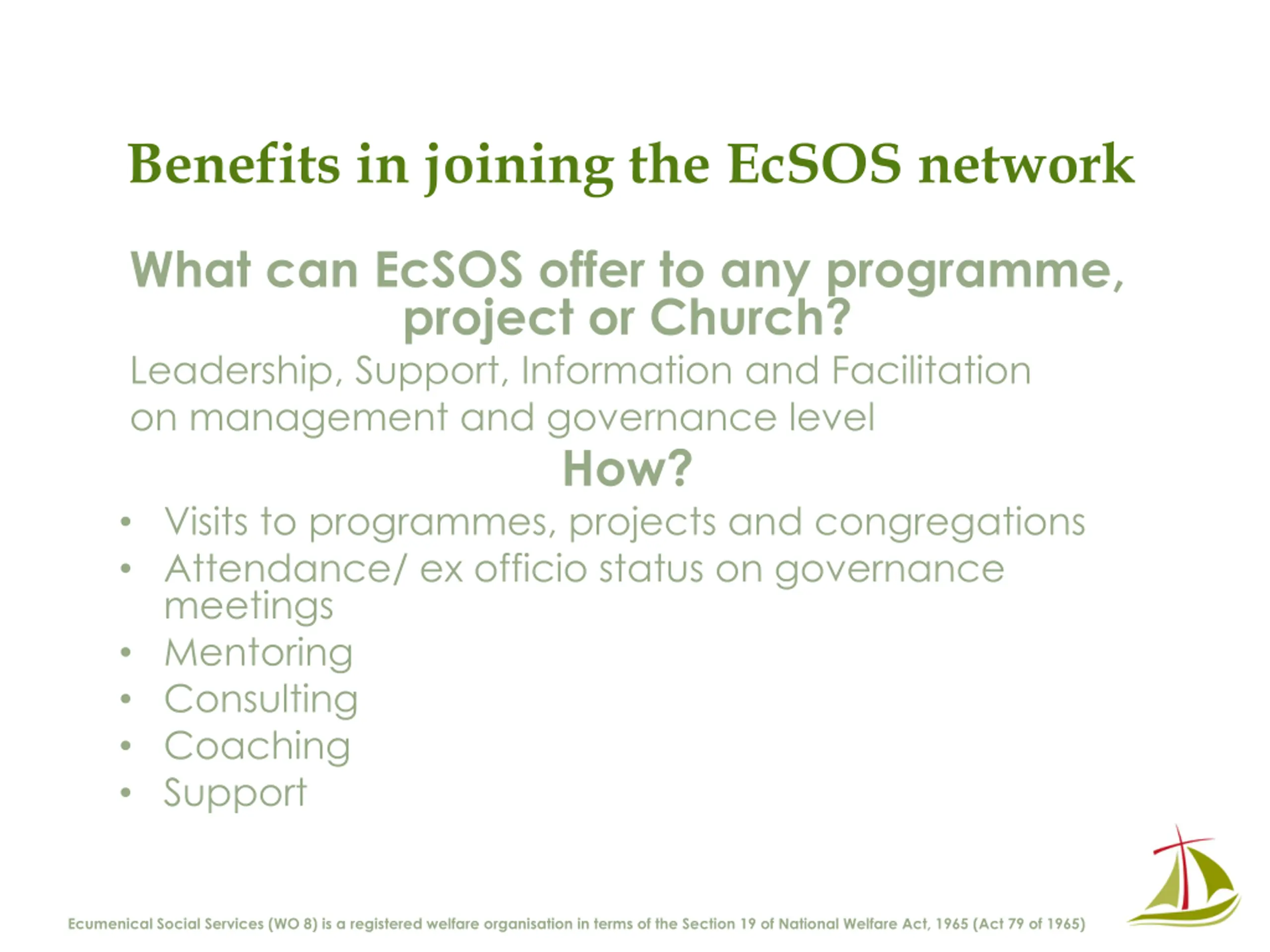 Benefits in joining the EcSOS network What can EcSOS offer to any programme, project or Church? Leadership, Support, Information and Facilitation on management and governance level How? Visits to programmes, projects and congregations Attendance/ ex officio status on governance meetings Mentoring Consulting Coaching Support Ecumenical Social Services (WO 8) is a registered welfare organisation in terms of the Section 19 of National Welfare Act, 1965 (Act 79 of 1965)