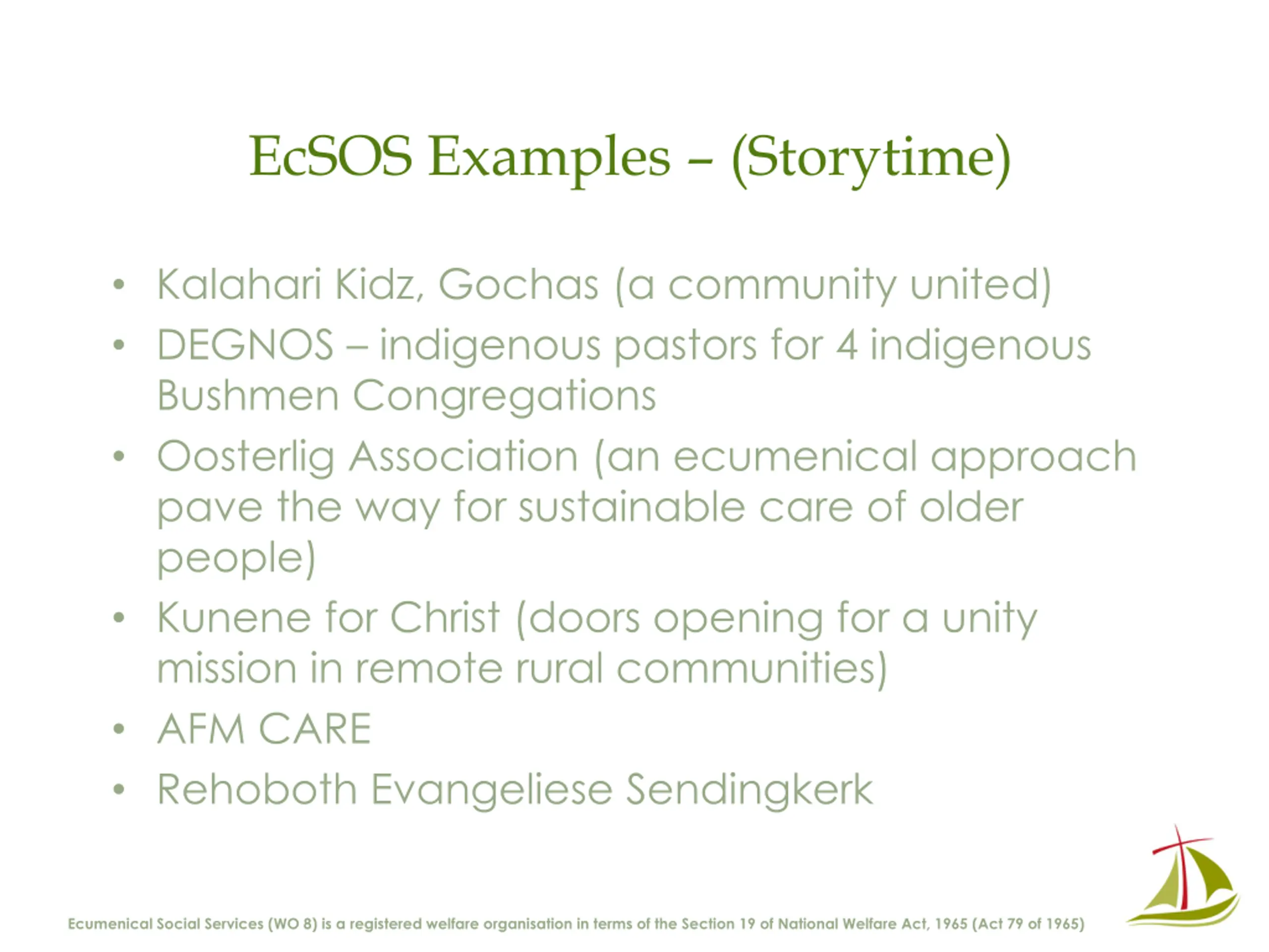 EcSOS Examples (Storytime) Kalahari Kidz, Gochas (a community united) DEGNOS indigenous pastors for 4 indigenous Bushmen Congregations Oosterlig Association (an ecumenical approach pave the way for sustainable care of older people) Kunene for Christ (doors opening for a unity mission in remote rural communities) AFM CARE Rehoboth Evangeliese Sendingkerk Ecumenical Social Services (WO 8) is a registered welfare organisation in terms of the Section 19 of National Welfare Act, 1965 (Act 79 of 1965)