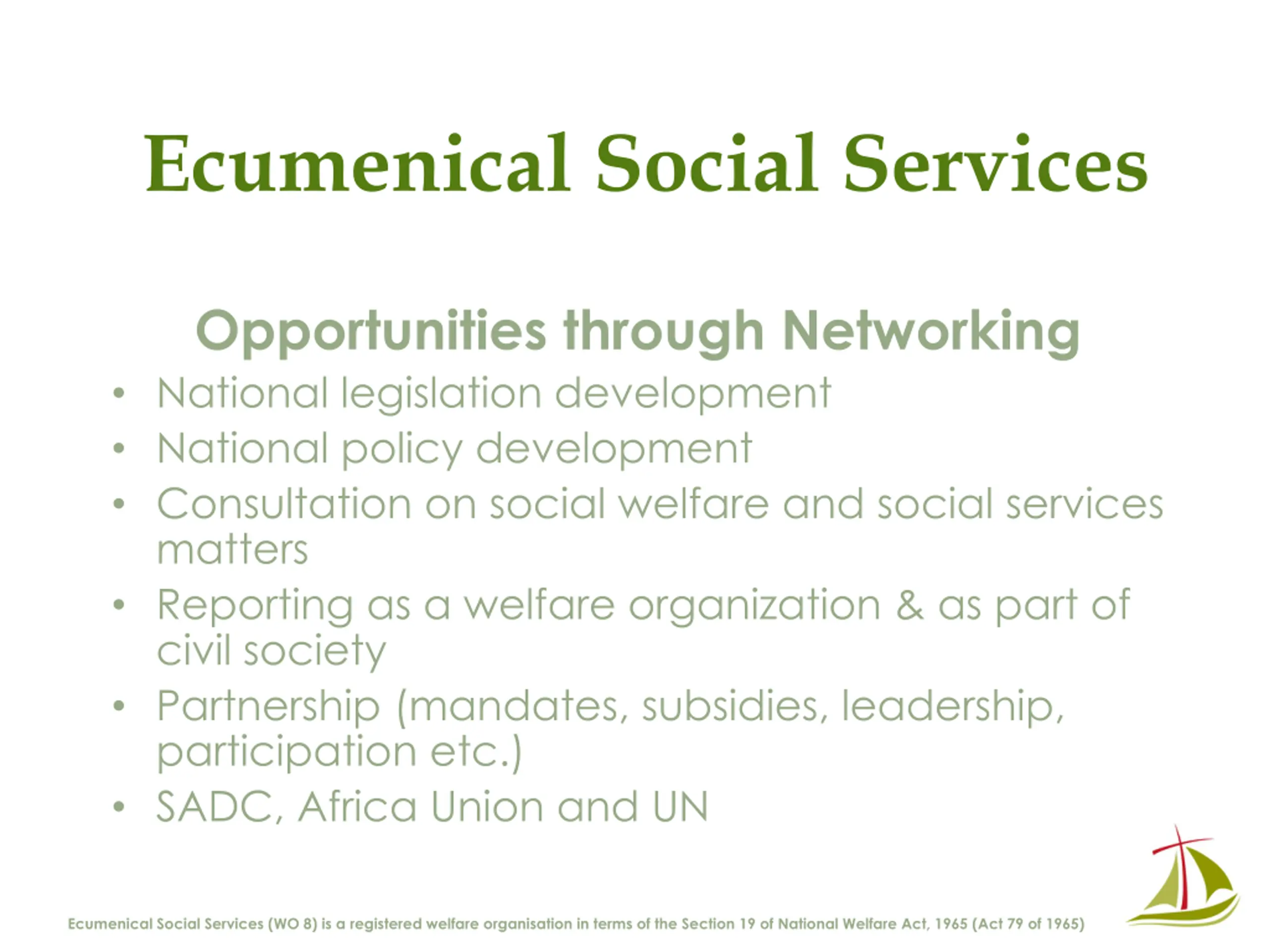 Ecumenical Social Services Opportunities through Networking National legislation development National policy development Consultation on social welfare and social services matters Reporting as a welfare organization & as part of civil society Partnership (mandates, subsidies, leadership, participation etc.) SADC, Africa Union and UN Ecumenical Social Services (WO 8) is a registered welfare organisation in terms of the Section 19 of National Welfare Act, 1965 (Act 79 of 1965)