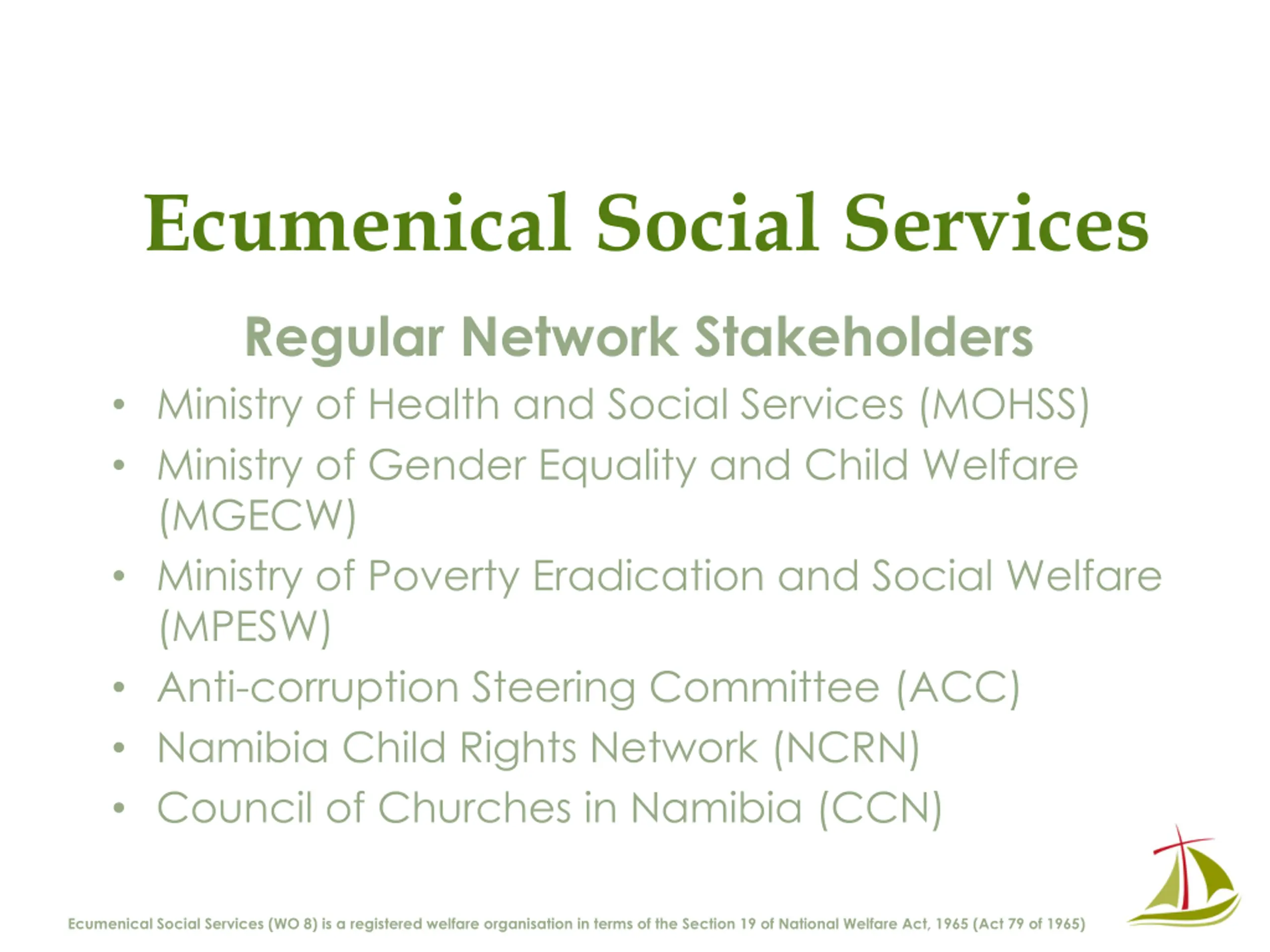 Ecumenical Social Services Regular Network Stakeholders Ministry of Health and Social Services (MOHSS) Ministry of Gender Equality and Child Welfare (MGECW) Ministry of Poverty Eradication and Social Welfare (MPESW) Anti-corruption Steering Committee (ACC) Namibia Child Rights Network (NCRN) Council of Churches in Namibia (CCN) Ecumenical Social Services (WO 8) is a registered welfare organisation in terms of the Section 19 of National Welfare Act, 1965 (Act 79 of 1965)