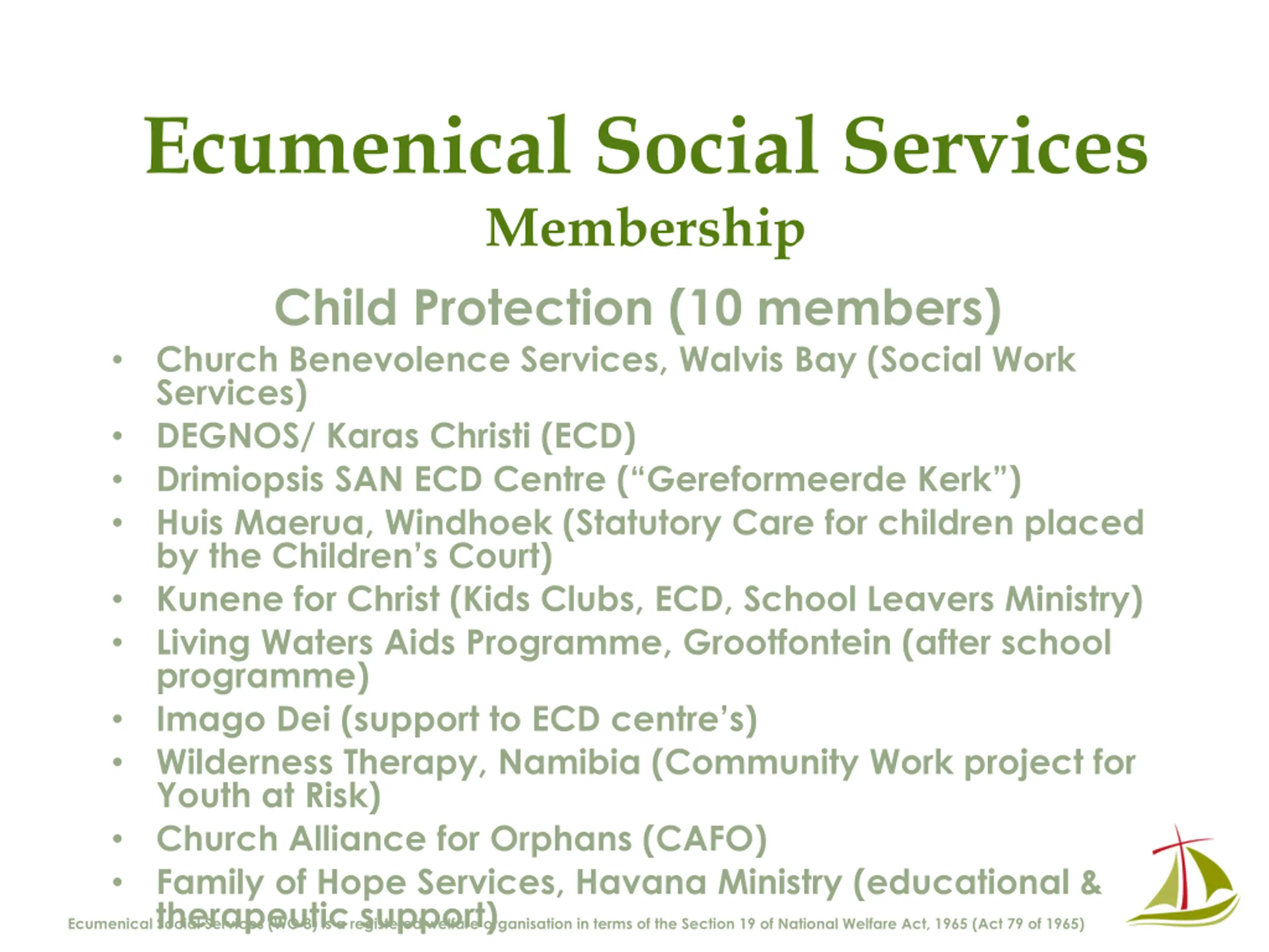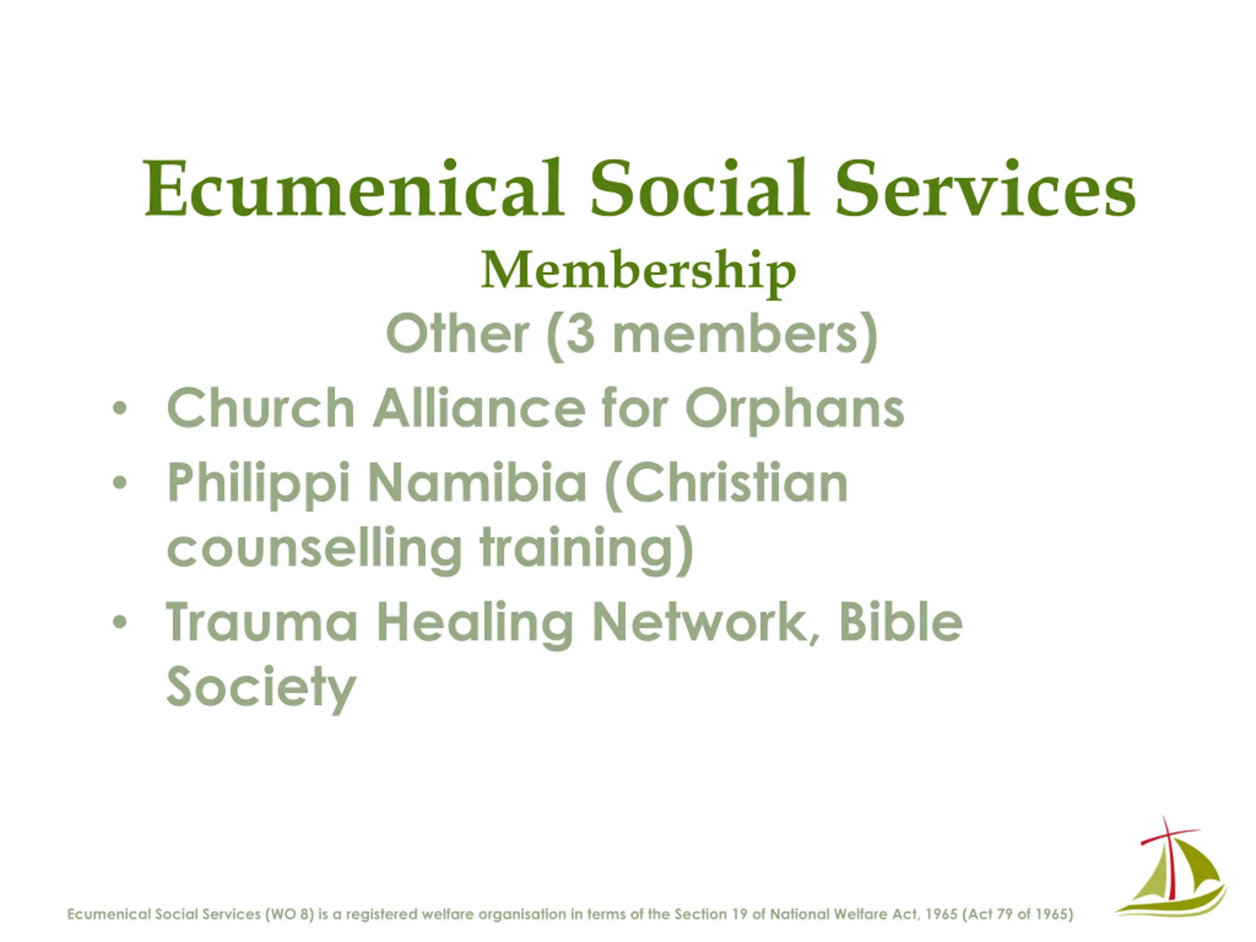 Ecumenical Social Services Membership Other (3 members) Church Alliance for Orphans Philippi Namibia (Christian counselling training) Trauma Healing Network, Bible Society Ecumenical Social Services (WO 8) is a registered welfare organisation in terms of the Section 19 of National Welfare Act, 1965 (Act 79 of 1965)