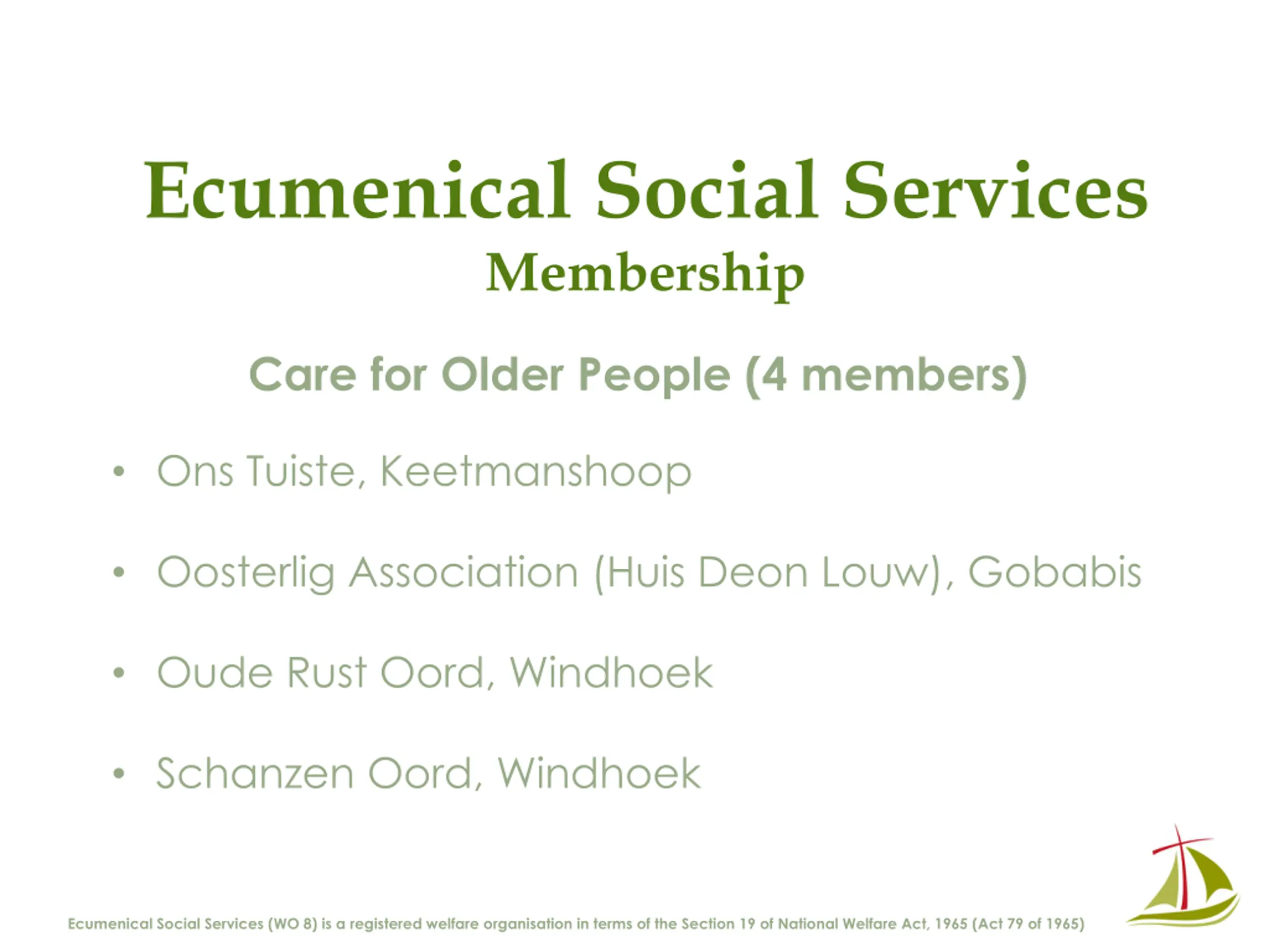 Ecumenical Social Services Membership Care for Older People (4 members) Ons Tuiste, Keetmanshoop Oosterlig Association (Huis Deon Louw), Gobabis Oude Rust Oord, Windhoek Schanzen Oord, Windhoek Ecumenical Social Services (WO 8) is a registered welfare organisation in terms of the Section 19 of National Welfare Act, 1965 (Act 79 of 1965)