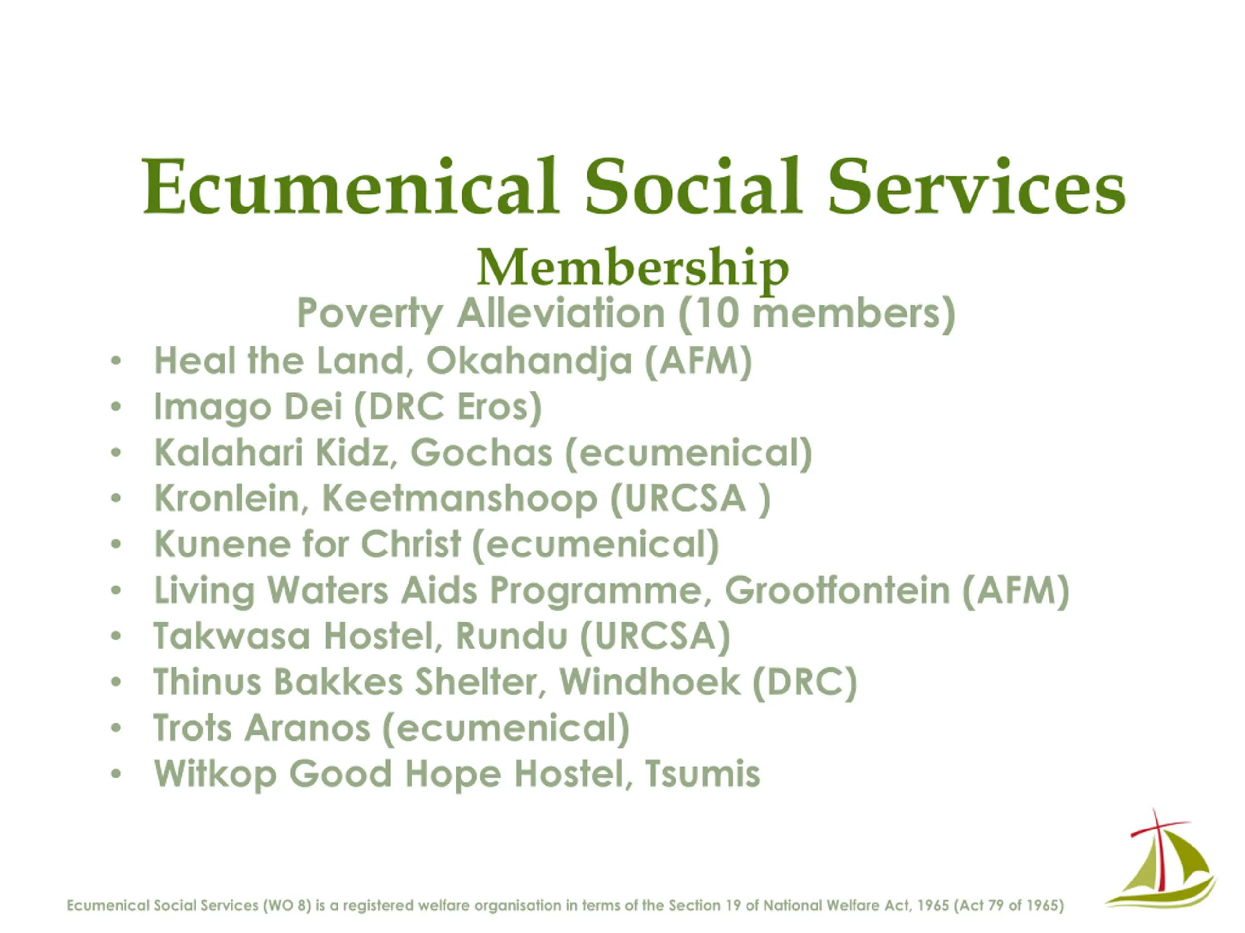 Ecumenical Social Services Membership Poverty Alleviation (10 members) Heal the Land, Okahandja (AFM) Imago Dei (DRC Eros) Kalahari Kidz, Gochas (ecumenical) Kronlein, Keetmanshoop (URCSA ) Kunene for Christ (ecumenical) Living Waters Aids Programme, Grootfontein (AFM) Takwasa Hostel, Rundu (URCSA) Thinus Bakkes Shelter, Windhoek (DRC) Trots Aranos (ecumenical) Witkop Good Hope Hostel, Tsumis Ecumenical Social Services (WO 8) is a registered welfare organisation in terms of the Section 19 of National Welfare Act, 1965 (Act 79 of 1965)