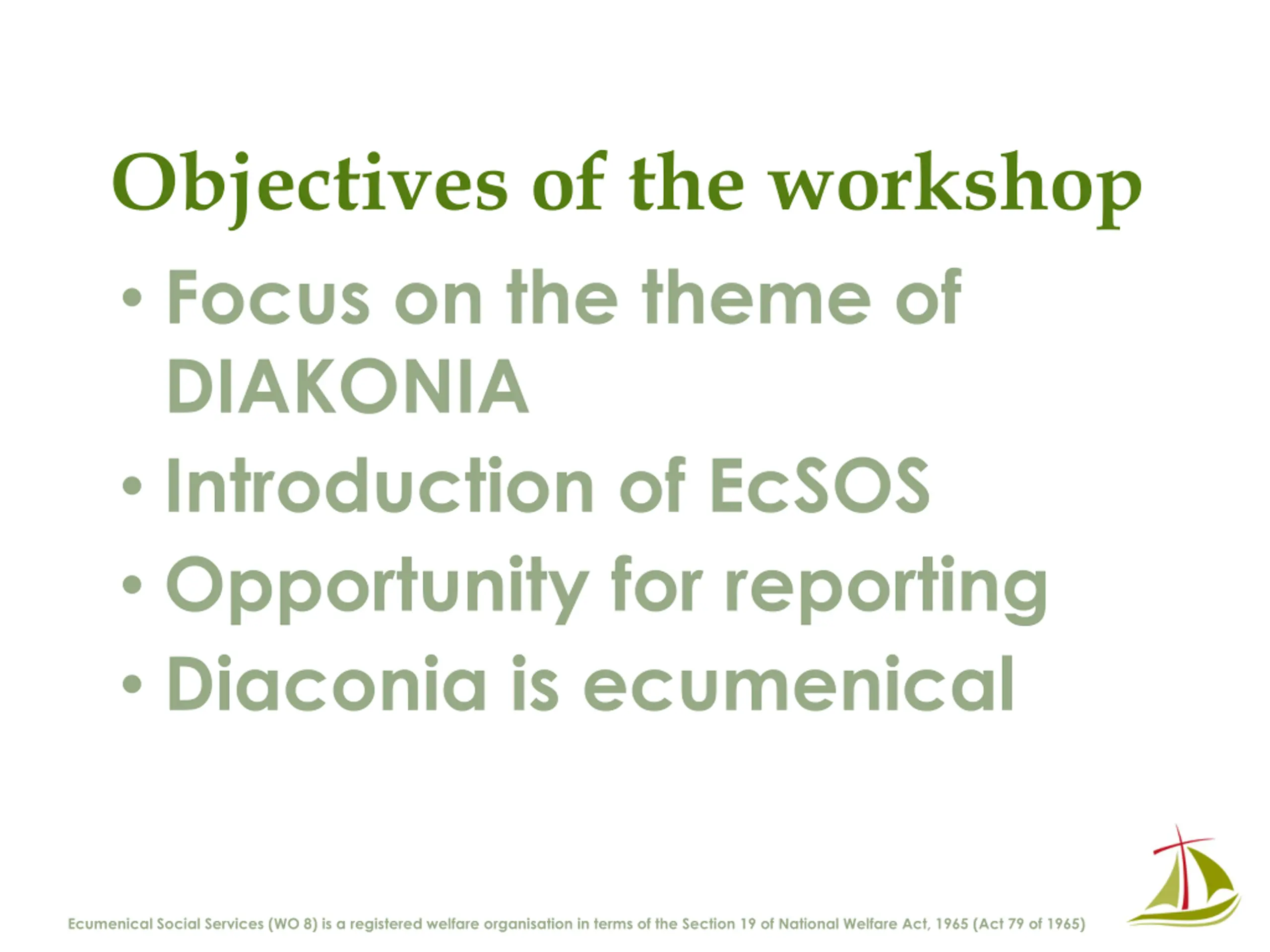 Objectives of the workshop Focus on the theme of DIAKONIA Introduction of EcSOS Opportunity for reporting Diaconia is ecumenical Ecumenical Social Services (WO 8) is a registered welfare organisation in terms of the Section 19 of National Welfare Act, 1965 (Act 79 of 1965)
