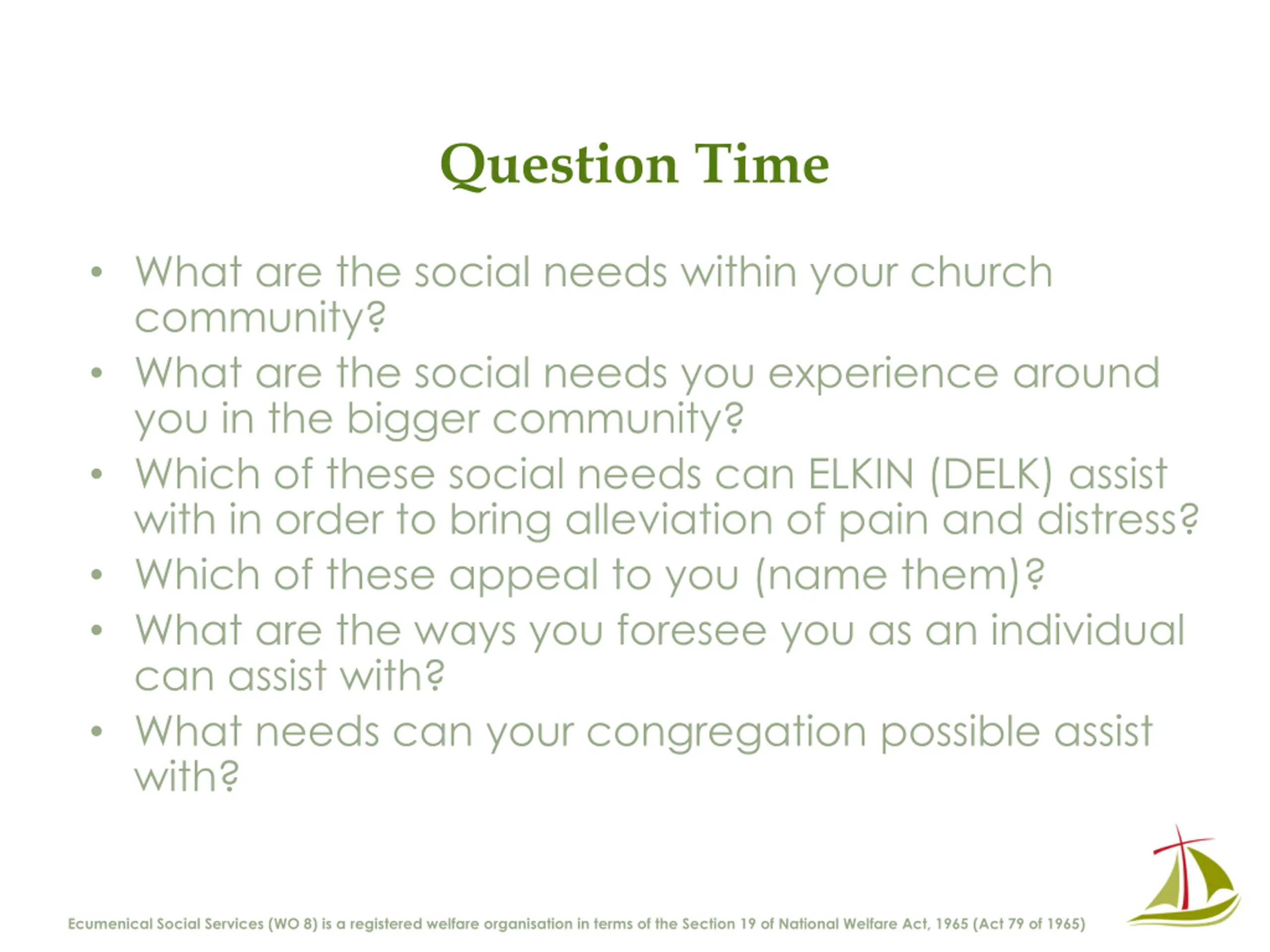 Question Time What are the social needs within your church community? What are the social needs you experience around you in the bigger community? Which of these social needs can ELKIN (DELK) assist with in order to bring alleviation of pain and distress? Which of these appeal to you (name them)? What are the ways you foresee you as an individual can assist with? What needs can your congregation possible assist with? Ecumenical Social Services (WO 8) is a registered welfare organisation in terms of the Section 19 of National Welfare Act, 1965 (Act 79 of 1965)