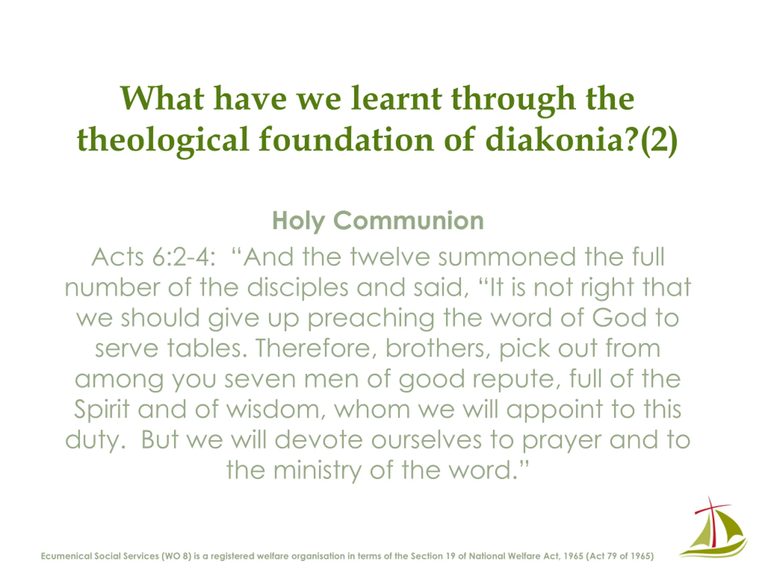 What have we learnt through the theological foundation of diakonia?(2) Holy Communion Acts 6:2-4: And the twelve summoned the full number of the disciples and said, It is not right that we should give up preaching the word of God to serve tables. Therefore, brothers, pick out from among you seven men of good repute, full of the Spirit and of wisdom, whom we will appoint to this duty. But we will devote ourselves to prayer and to the ministry of the word. Ecumenical Social Services (WO 8) is a registered welfare organisation in terms of the Section 19 of National Welfare Act, 1965 (Act 79 of 1965)