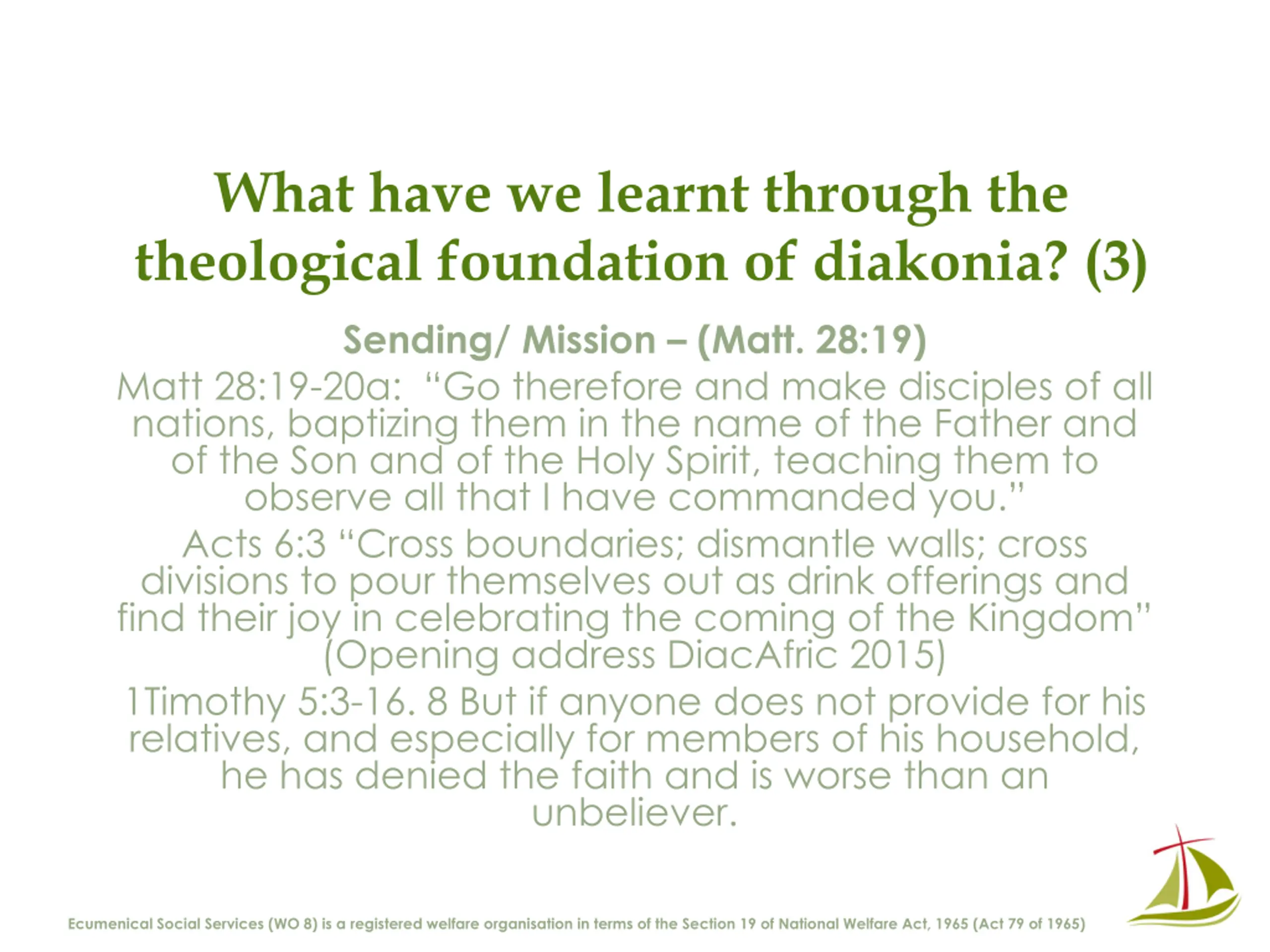 What have we learnt through the theological foundation of diakonia? (3) Sending/ Mission (Matt. 28:19) Matt 28:19-20a: Go therefore and make disciples of all nations, baptizing them in the name of the Father and of the Son and of the Holy Spirit, teaching them to observe all that I have commanded you. Acts 6:3 Cross boundaries; dismantle walls; cross divisions to pour themselves out as drink offerings and find their joy in celebrating the coming of the Kingdom (Opening address DiacAfric 2015) 1Timothy 5:3-16. 8 But if anyone does not provide for his relatives, and especially for members of his household, he has denied the faith and is worse than an unbeliever. Ecumenical Social Services (WO 8) is a registered welfare organisation in terms of the Section 19 of National Welfare Act, 1965 (Act 79 of 1965)