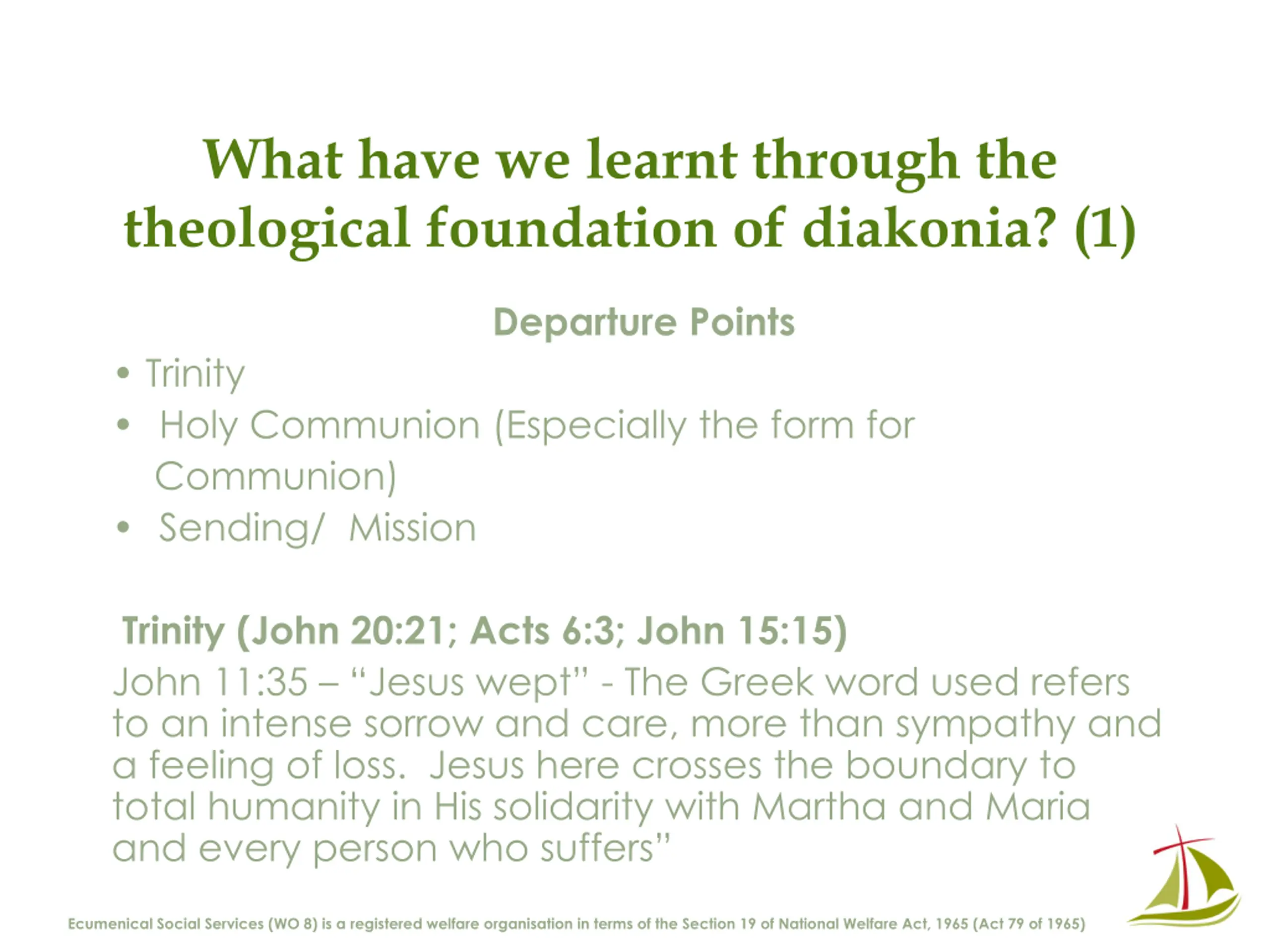 What have we learnt through the theological foundation of diakonia? (1) Departure Points Trinity Holy Communion (Especially the form for Communion) Sending/ Mission Trinity (John 20:21; Acts 6:3; John 15:15) John 11:35 Jesus wept - The Greek word used refers to an intense sorrow and care, more than sympathy and a feeling of loss. Jesus here crosses the boundary to total humanity in His solidarity with Martha and Maria and every person who suffers Ecumenical Social Services (WO 8) is a registered welfare organisation in terms of the Section 19 of National Welfare Act, 1965 (Act 79 of 1965)