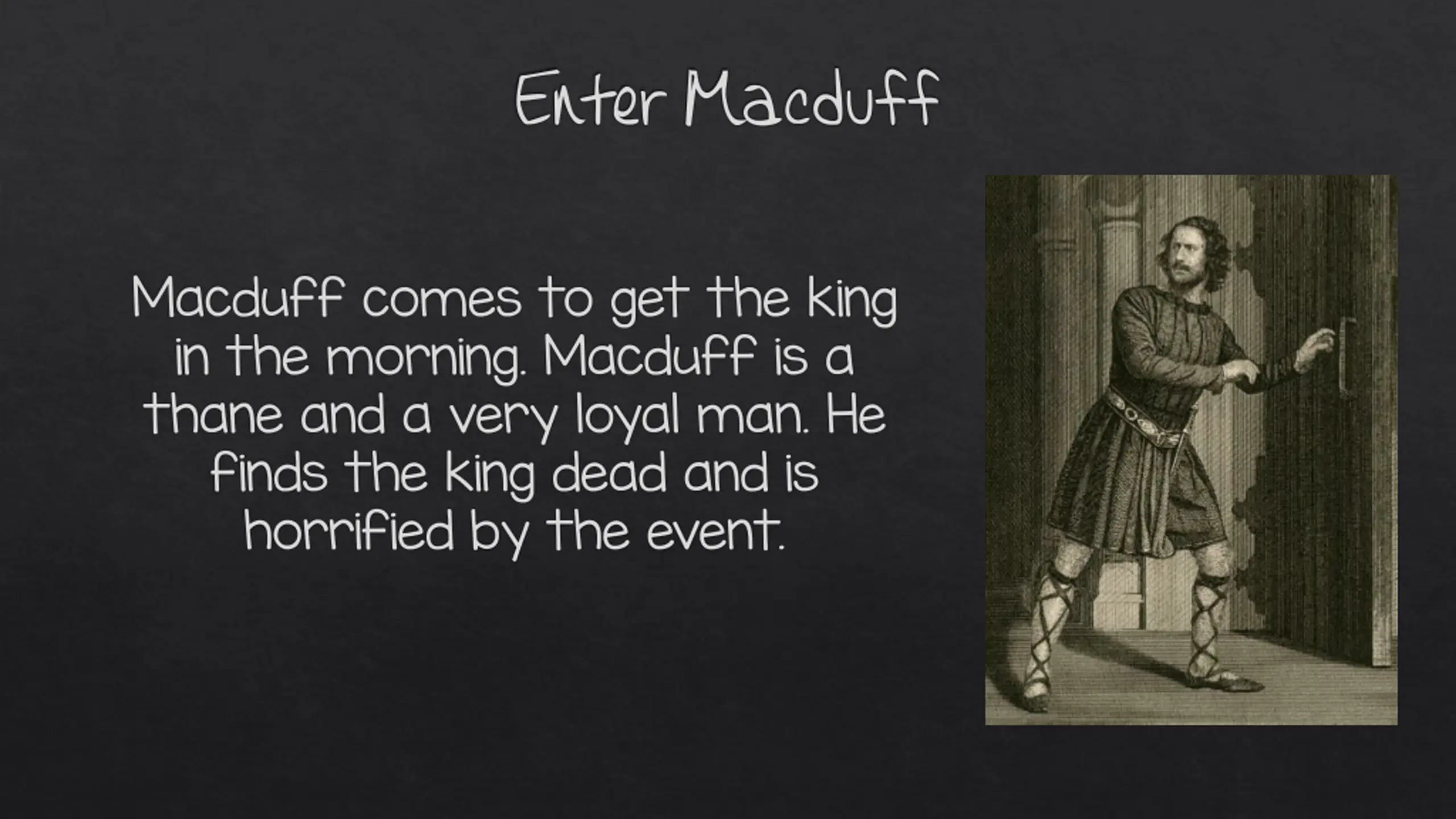 Enter Macduff Macduff comes to get the king in the morning. Macduff is a thane and a very loyal man. He finds the king dead and is horrified by the event.