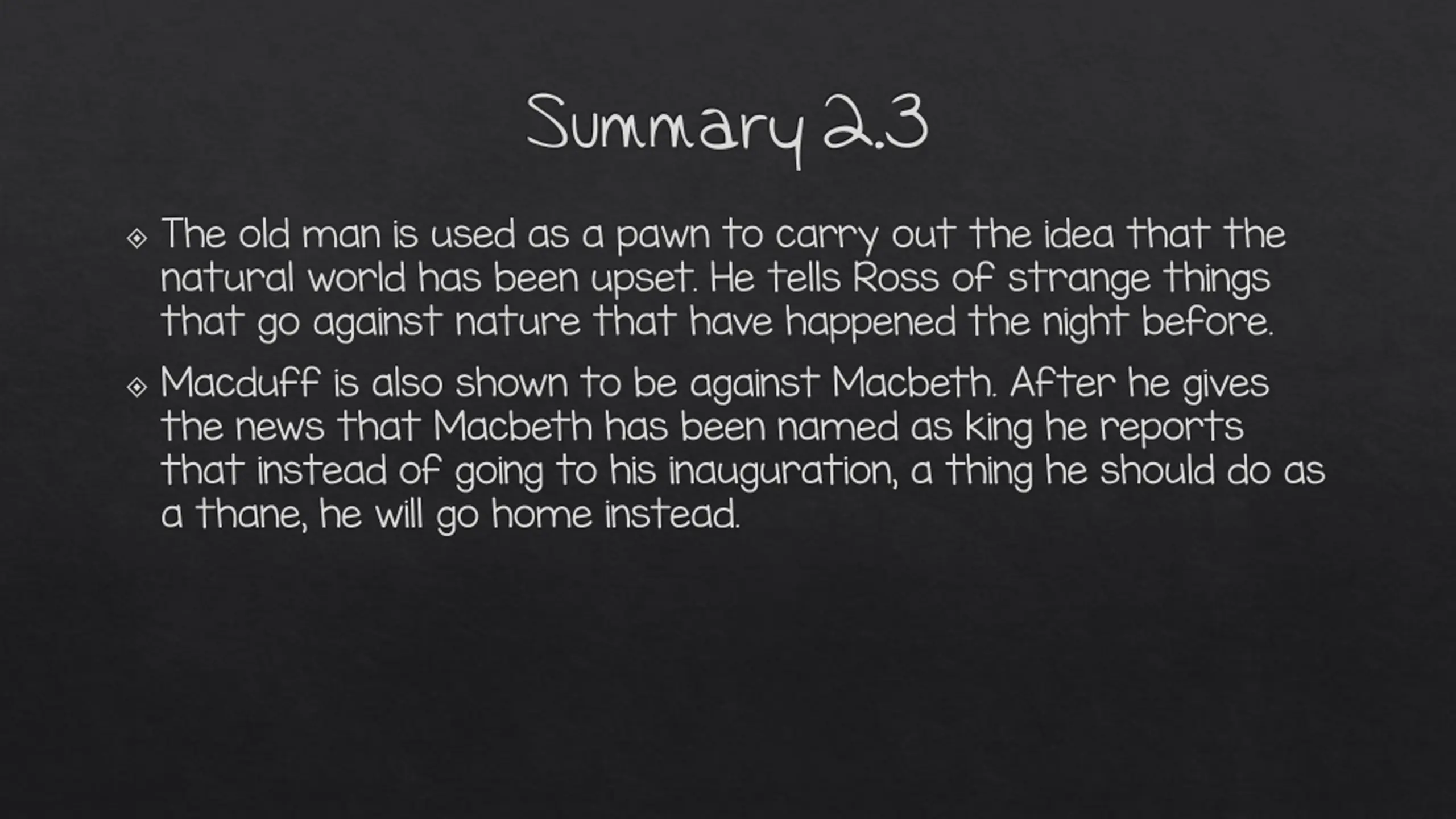 Summary 2.3 The old man is used as a pawn to carry out the idea that the natural world has been upset. He tells Ross of strange things that go against nature that have happened the night before. Macduff is also shown to be against Macbeth. After he gives the news that Macbeth has been named as king he reports that instead of going to his inauguration, a thing he should do as a thane, he will go home instead.