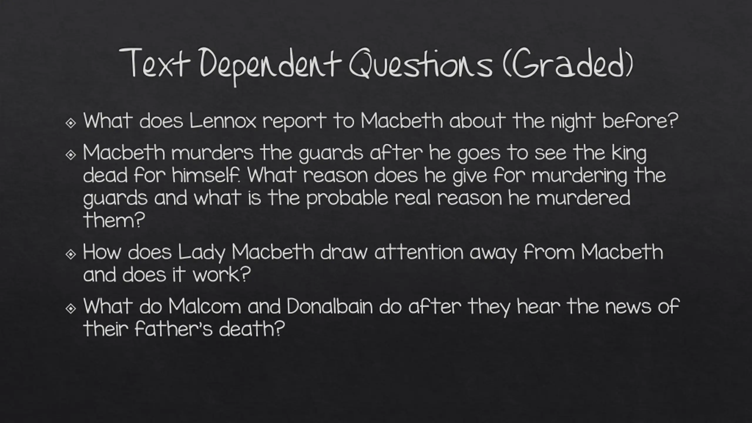 Text Dependent Questions (Graded) What does Lennox report to Macbeth about the night before? Macbeth murders the guards after he goes to see the king dead for himself. What reason does he give for murdering the guards and what is the probable real reason he murdered them? How does Lady Macbeth draw attention away from Macbeth and does it work? What do Malcom and Donalbain do after they hear the news of their father s death?