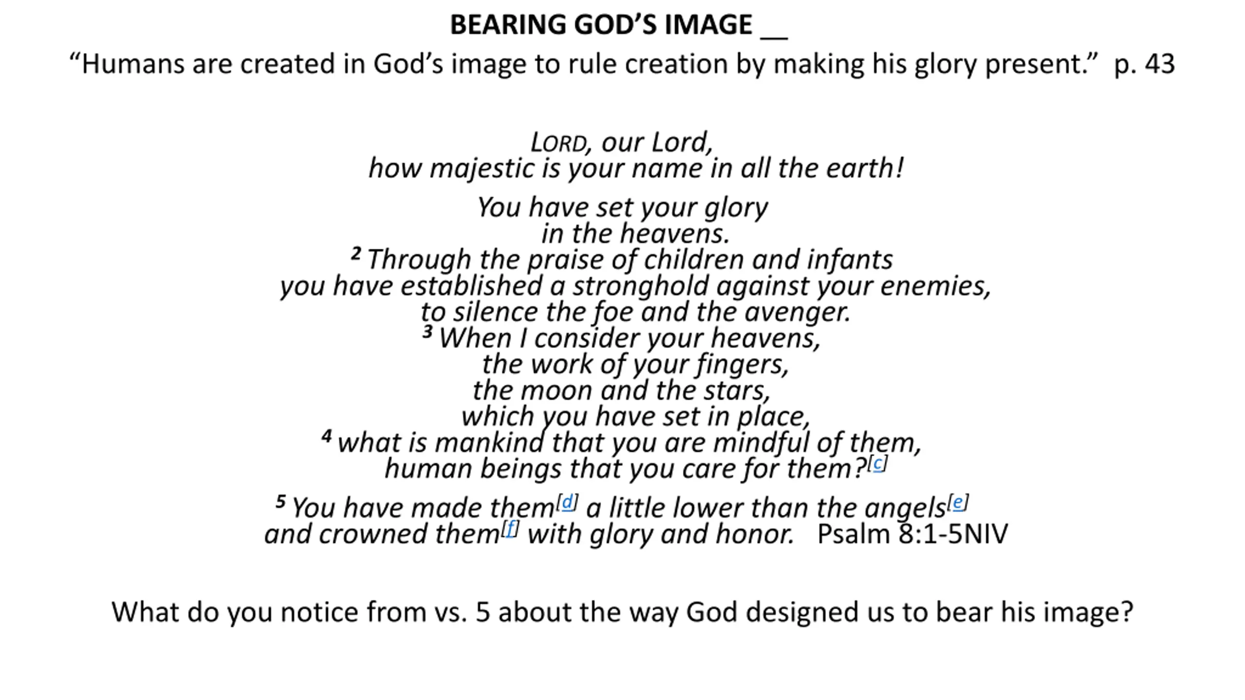 BEARING GODS IMAGE Humans are created in God s image to rule creation by making his glory present. p. 43 LORD, our Lord, how majestic is your name in all the earth! You have set your glory in the heavens. 2Through the praise of children and infants you have established a stronghold against your enemies, to silence the foe and the avenger. 3When I consider your heavens, the work of your fingers, the moon and the stars, which you have set in place, 4what is mankind that you are mindful of them, human beings that you care for them?[c] 5You have made them[d]a little lower than the angels[e] and crowned them[f]with glory and honor. Psalm 8:1-5NIV What do you notice from vs. 5 about the way God designed us to bear his image?