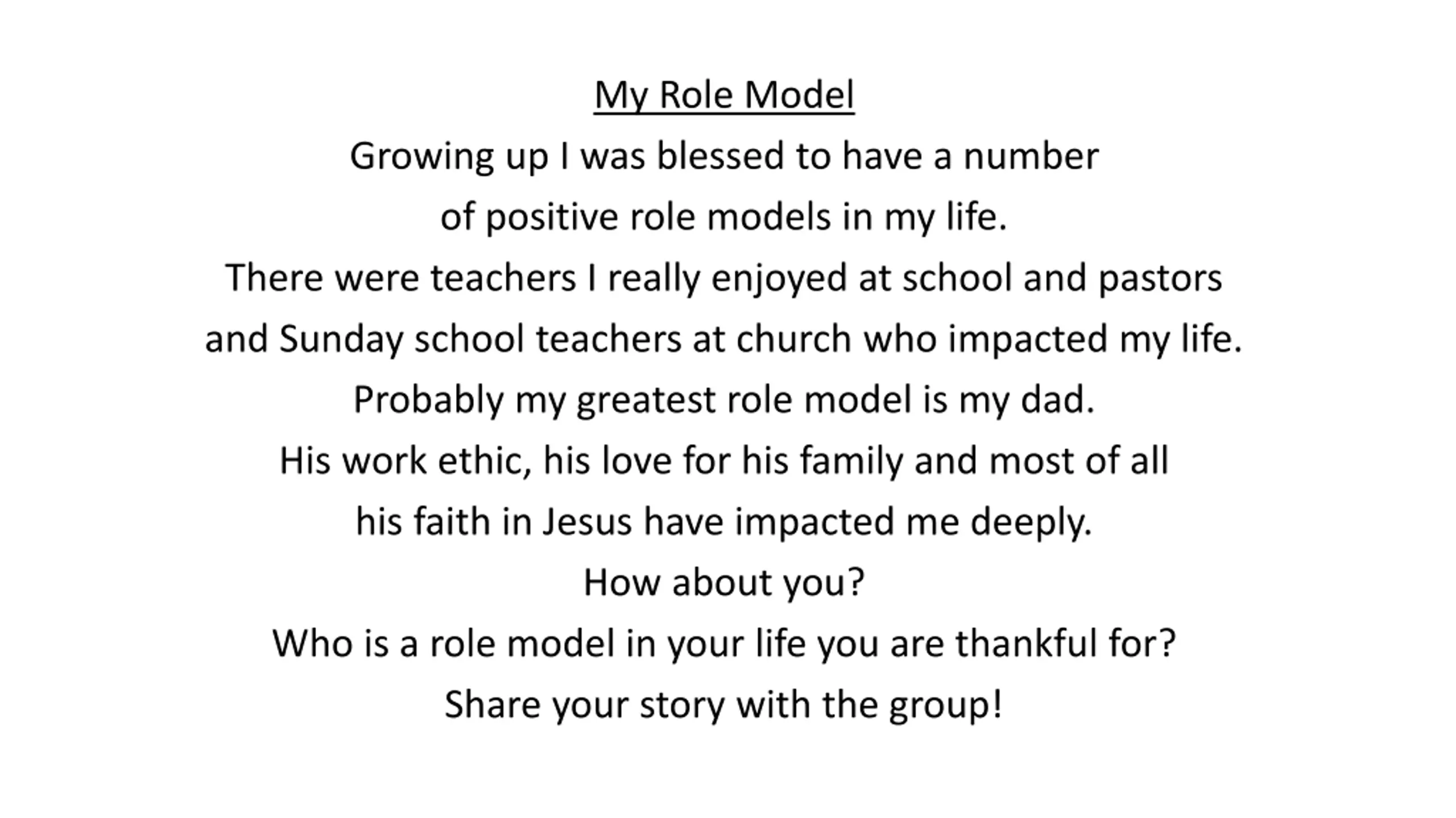 My Role Model Growing up I was blessed to have a number of positive role models in my life. There were teachers I really enjoyed at school and pastors and Sunday school teachers at church who impacted my life. Probably my greatest role model is my dad. His work ethic, his love for his family and most of all his faith in Jesus have impacted me deeply. How about you? Who is a role model in your life you are thankful for? Share your story with the group!