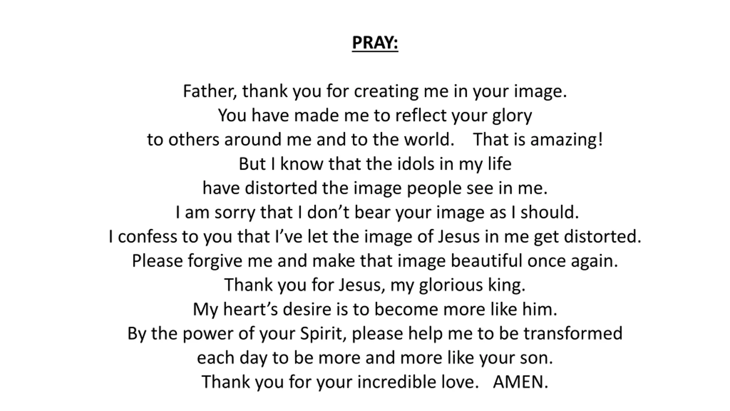 PRAY: Father, thank you for creating me in your image. You have made me to reflect your glory to others around me and to the world. That is amazing! But I know that the idols in my life have distorted the image people see in me. I am sorry that I don t bear your image as I should. I confess to you that I ve let the image of Jesus in me get distorted. Please forgive me and make that image beautiful once again. Thank you for Jesus, my glorious king. My heart s desire is to become more like him. By the power of your Spirit, please help me to be transformed each day to be more and more like your son. Thank you for your incredible love. AMEN.