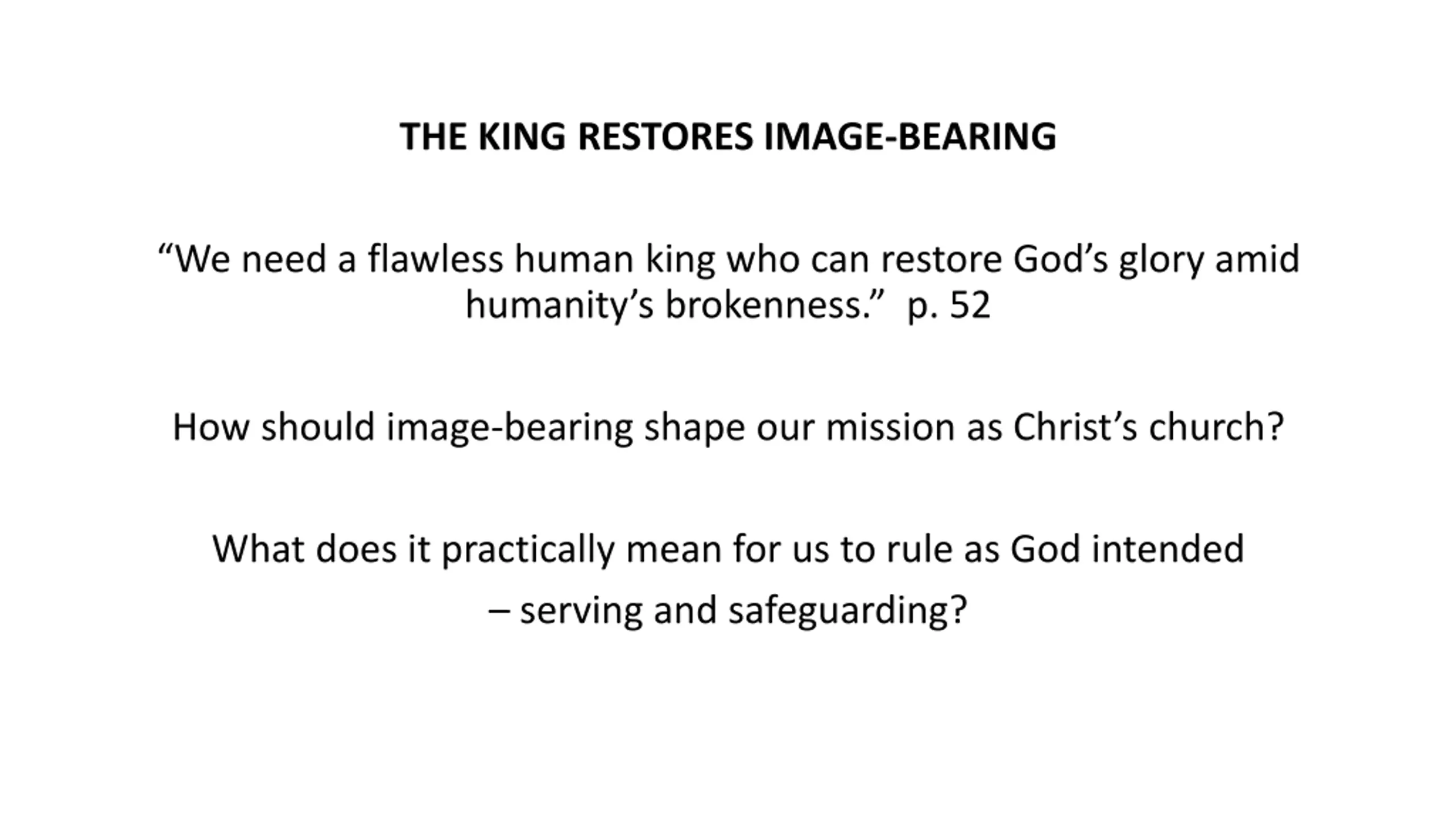 THE KING RESTORES IMAGE-BEARING We need a flawless human king who can restore God s glory amid humanity s brokenness. p. 52 How should image-bearing shape our mission as Christ s church? What does it practically mean for us to rule as God intended serving and safeguarding?