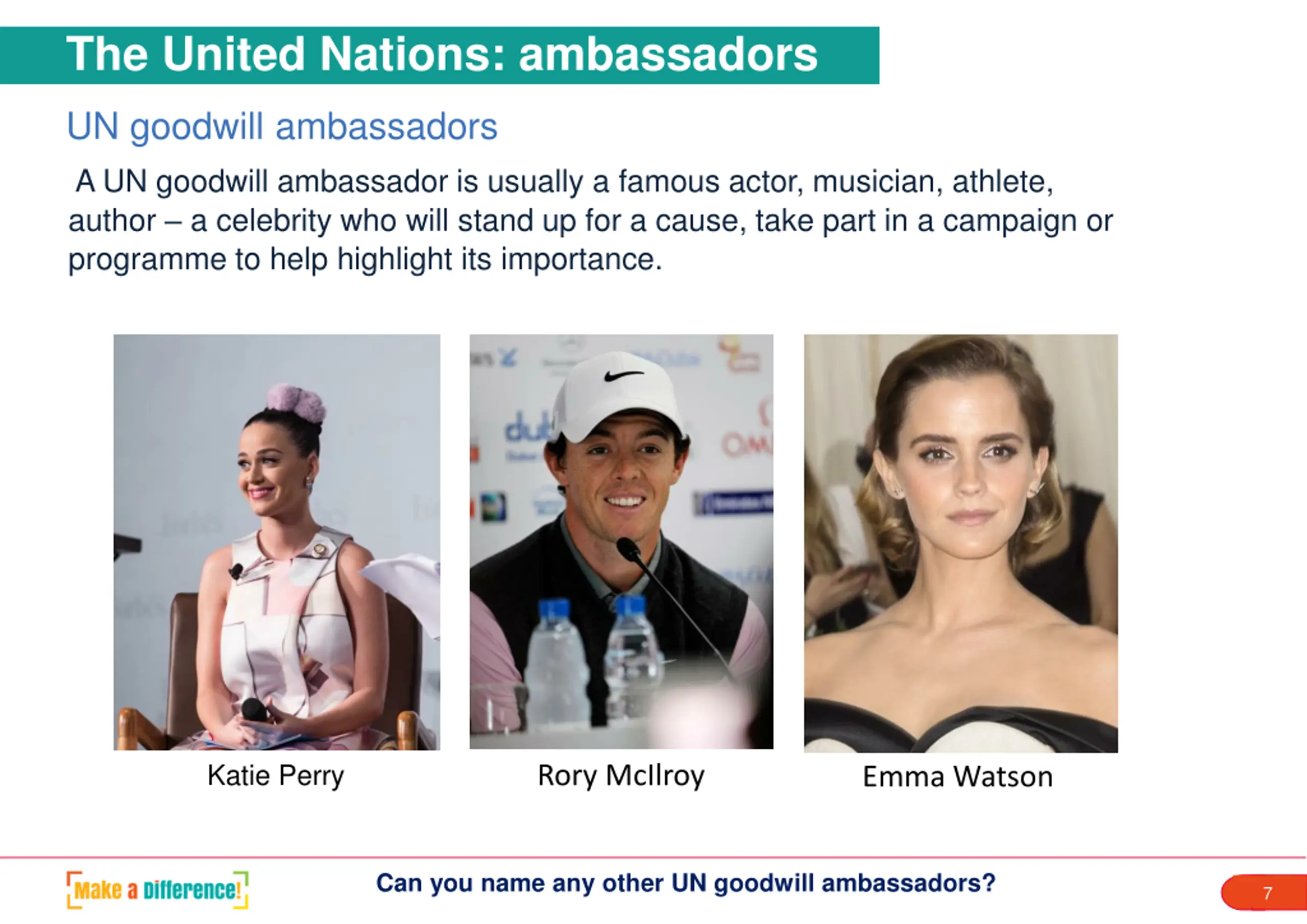 The United Nations: ambassadors UN goodwill ambassadors A UN goodwill ambassador is usually a famous actor, musician, athlete, author a celebrity who will stand up for a cause, take part in a campaign or programme to help highlight its importance. Katie Perry Rory McIlroy Emma Watson Can you name any other UN goodwill ambassadors? 7