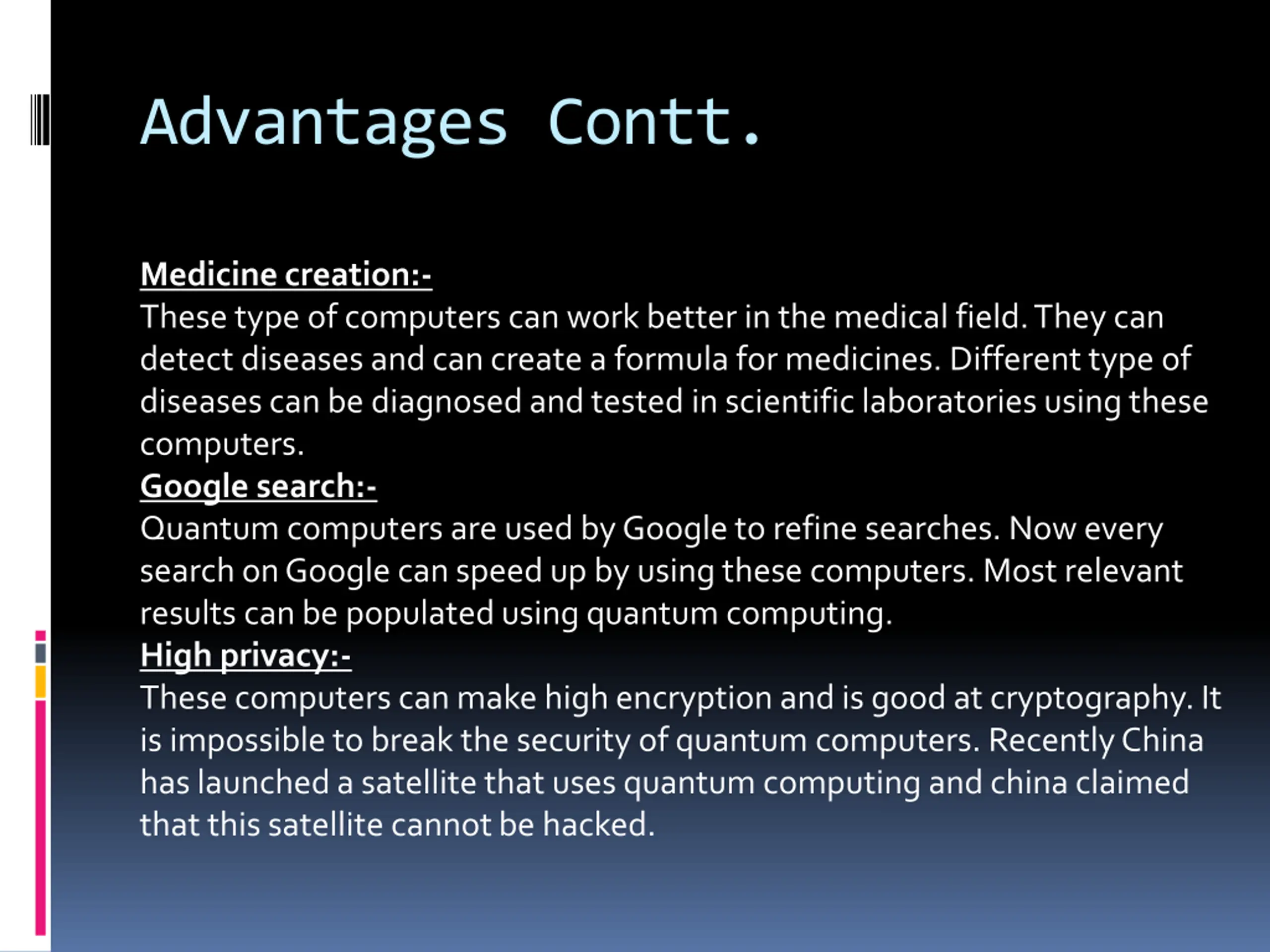 Advantages Contt. Medicine creation:- These type of computers can work better in the medical field. They can detect diseases and can create a formula for medicines. Different type of diseases can be diagnosed and tested in scientific laboratories using these computers. Google search:- Quantum computers are used by Google to refine searches. Now every search on Google can speed up by using these computers. Most relevant results can be populated using quantum computing. High privacy:- These computers can make high encryption and is good at cryptography. It is impossible to break the security of quantum computers. Recently China has launched a satellite that uses quantum computing and china claimed that this satellite cannot be hacked.