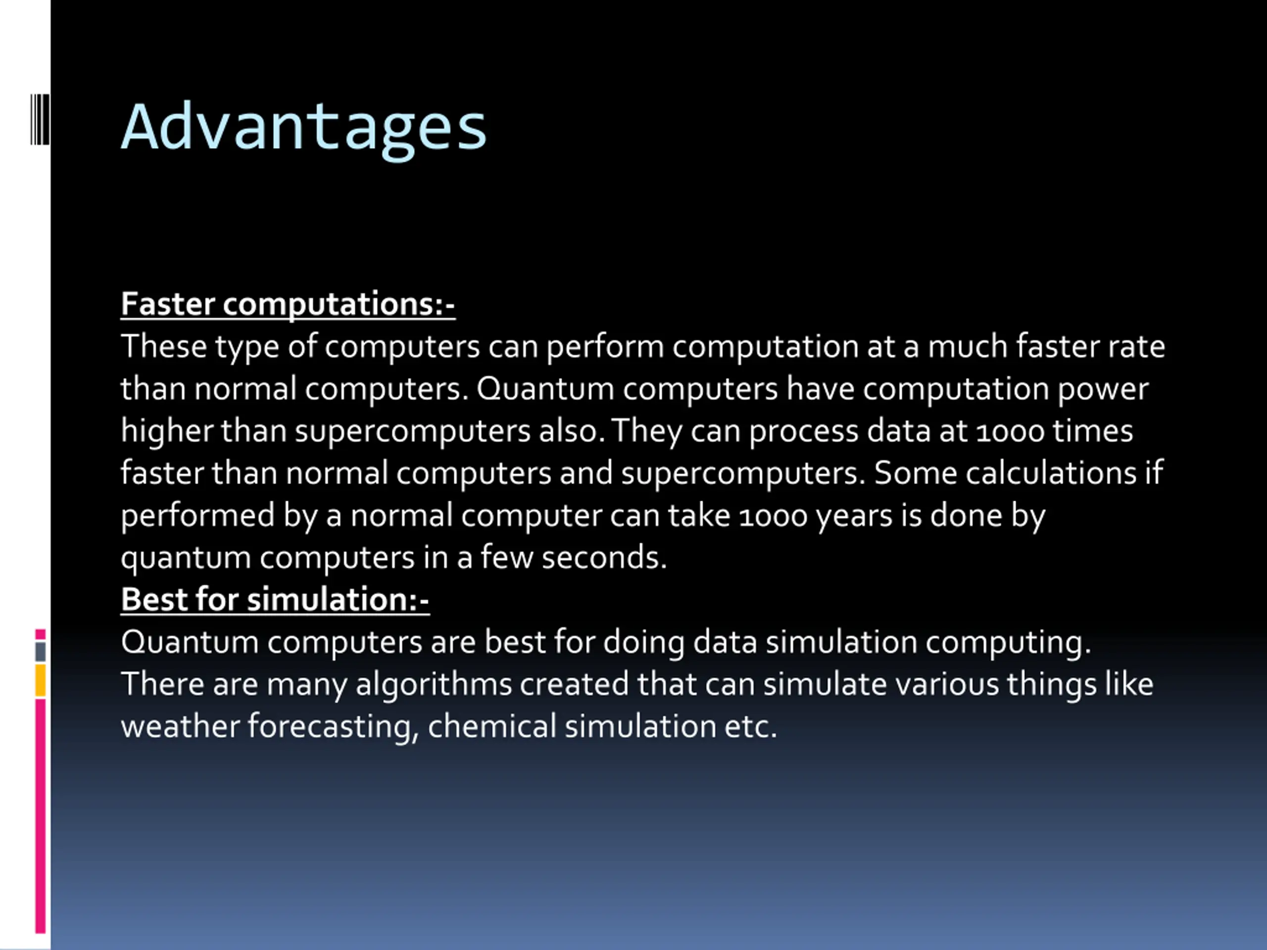 Advantages Faster computations:- These type of computers can perform computation at a much faster rate than normal computers. Quantum computers have computation power higher than supercomputers also. They can process data at 1000 times faster than normal computers and supercomputers. Some calculations if performed by a normal computer can take 1000 years is done by quantum computers in a few seconds. Best for simulation:- Quantum computers are best for doing data simulation computing. There are many algorithms created that can simulate various things like weather forecasting, chemical simulation etc.