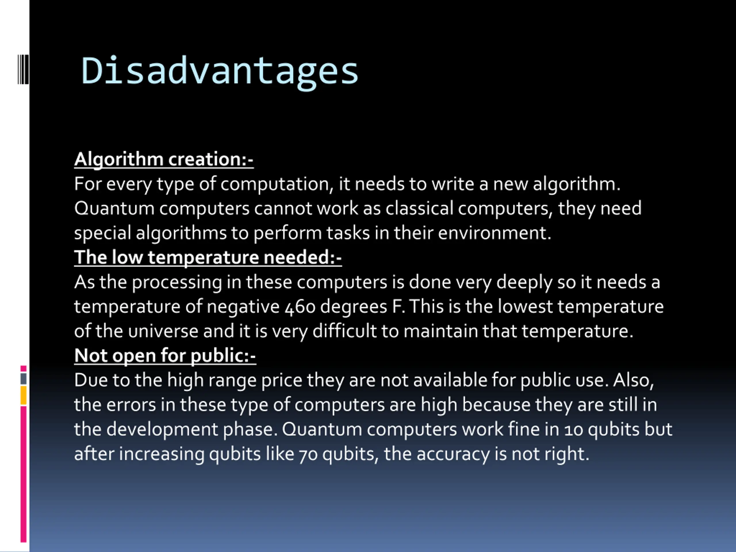 Disadvantages Algorithm creation:- For every type of computation, it needs to write a new algorithm. Quantum computers cannot work as classical computers, they need special algorithms to perform tasks in their environment. The low temperature needed:- As the processing in these computers is done very deeply so it needs a temperature of negative 460 degrees F. This is the lowest temperature of the universe and it is very difficult to maintain that temperature. Not open for public:- Due to the high range price they are not available for public use. Also, the errors in these type of computers are high because they are still in the development phase. Quantum computers work fine in 10 qubits but after increasing qubits like 70 qubits, the accuracy is not right.