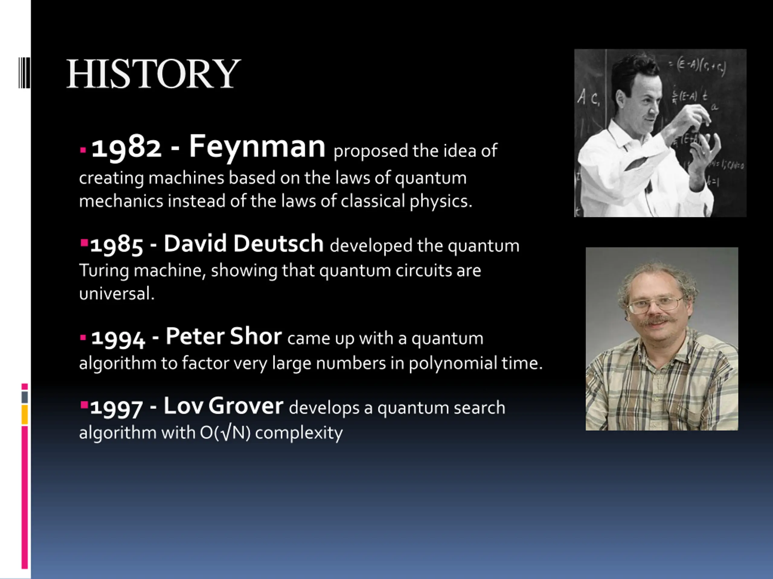 HISTORY 1982 - Feynman proposed the idea of creating machines based on the laws of quantum mechanics instead of the laws of classical physics. 1985 - David Deutsch developed the quantum Turing machine, showing that quantum circuits are universal. 1994 - Peter Shor came up with a quantum algorithm to factor very large numbers in polynomial time. 1997 - Lov Grover develops a quantum search algorithm with O( N) complexity