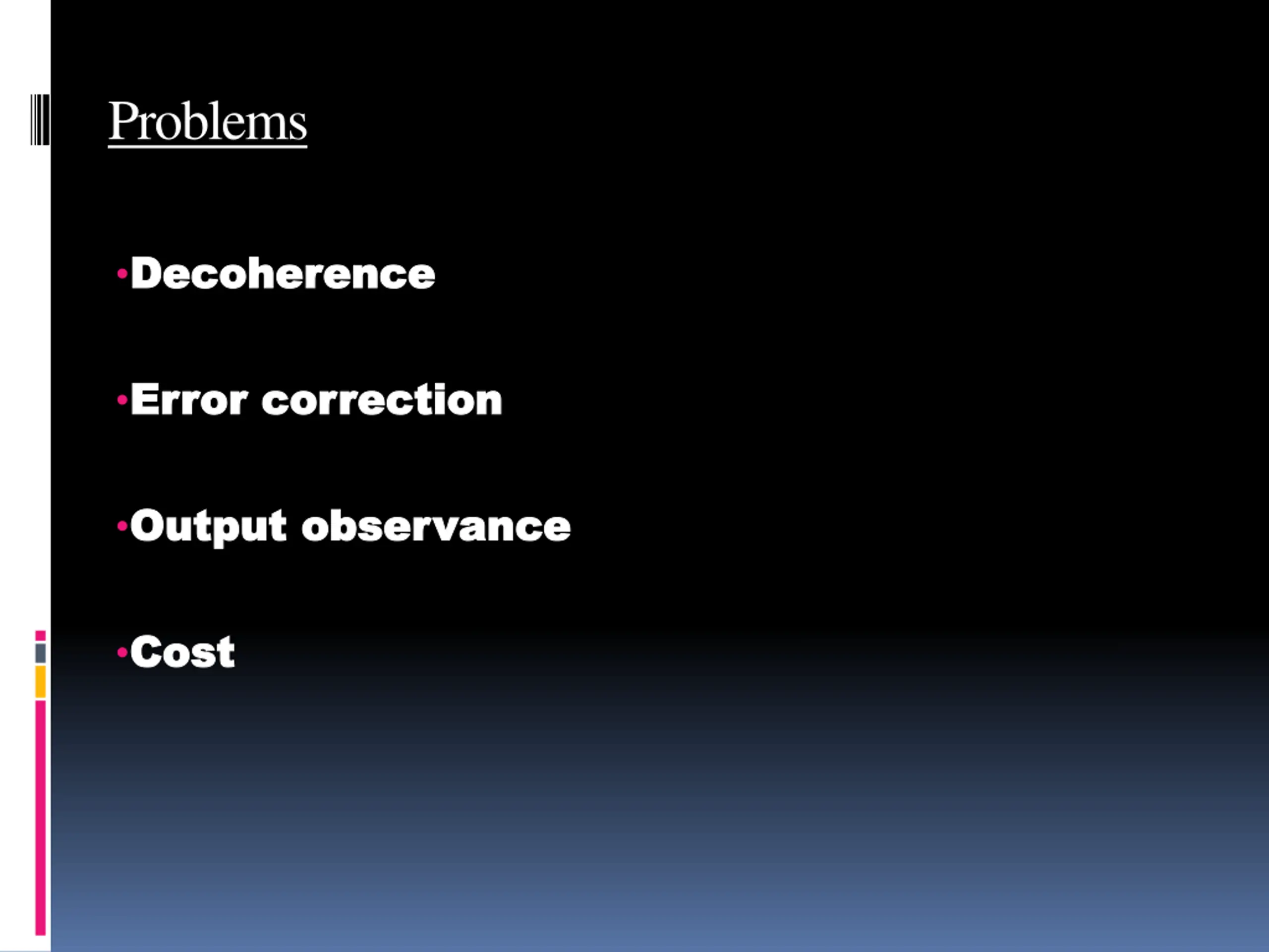 Problems Decoherence Decoherence Error correction Error correction Output observance Output observance Cost Cost