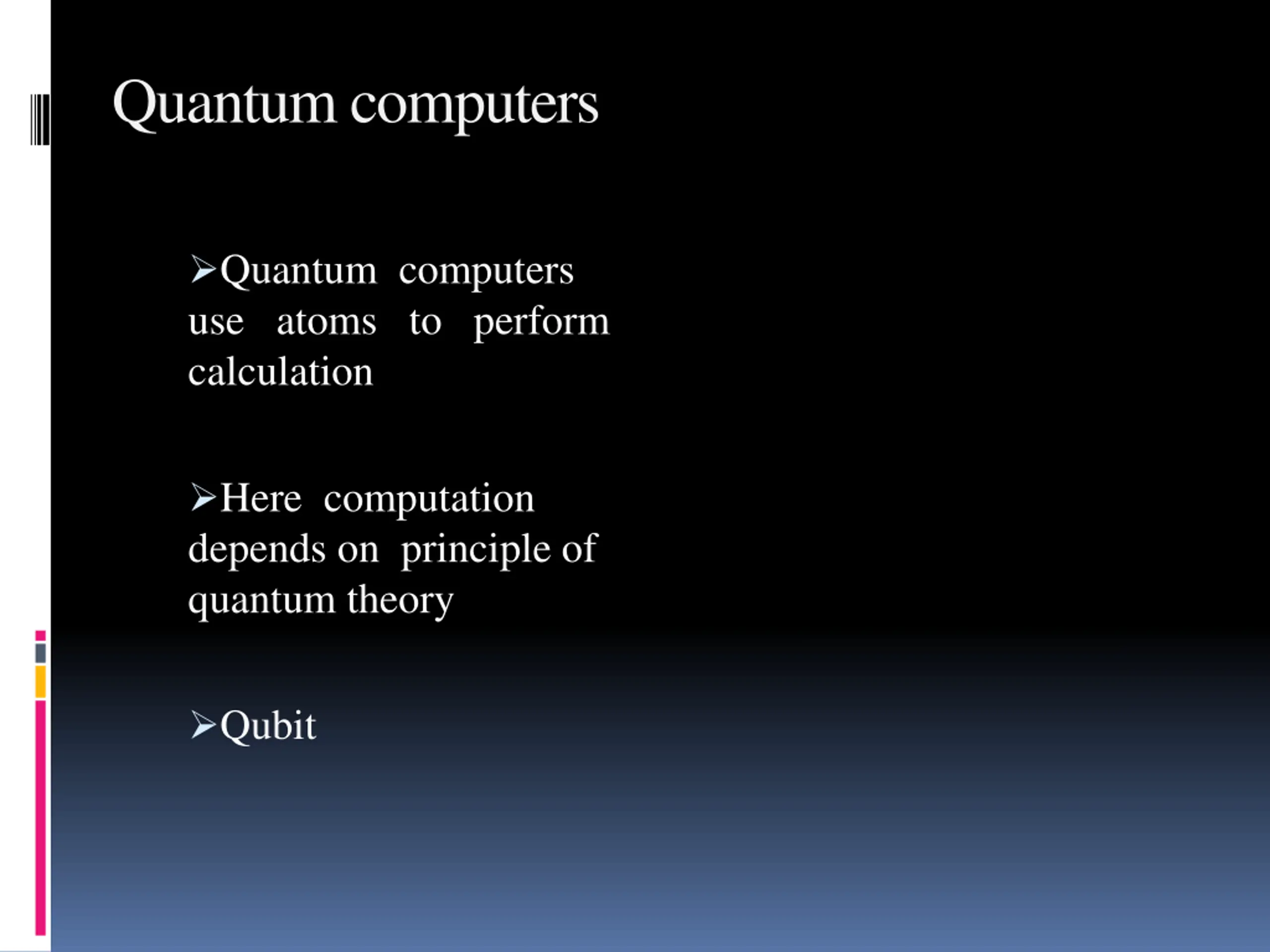 Quantum computers Quantum computers use atoms to perform calculation Here computation depends on principle of quantum theory Qubit