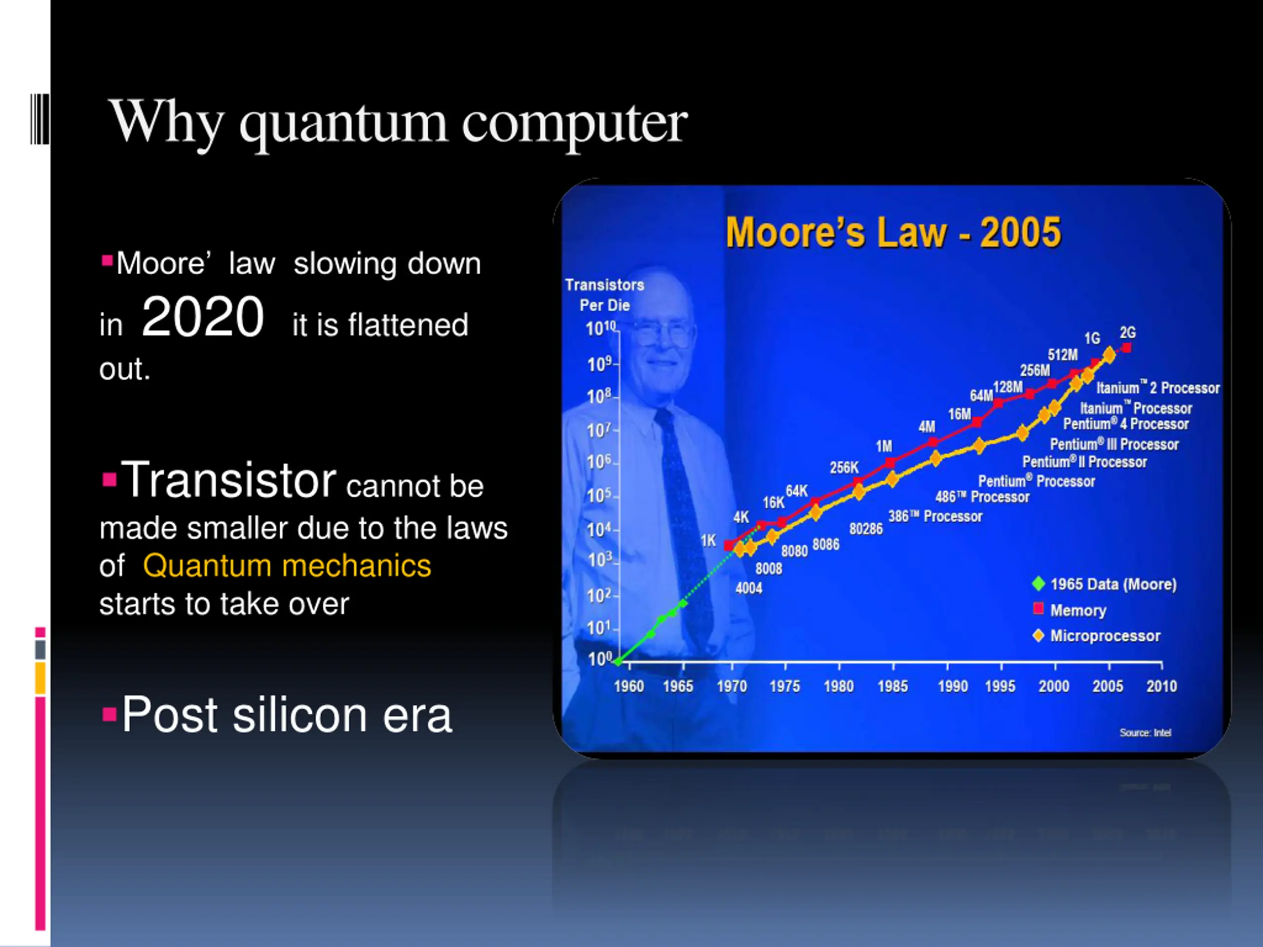 Why quantum computer Moore law slowing down in 2020 it is flattened out. Transistor cannot be made smaller due to the laws of Quantum mechanics starts to take over Post silicon era