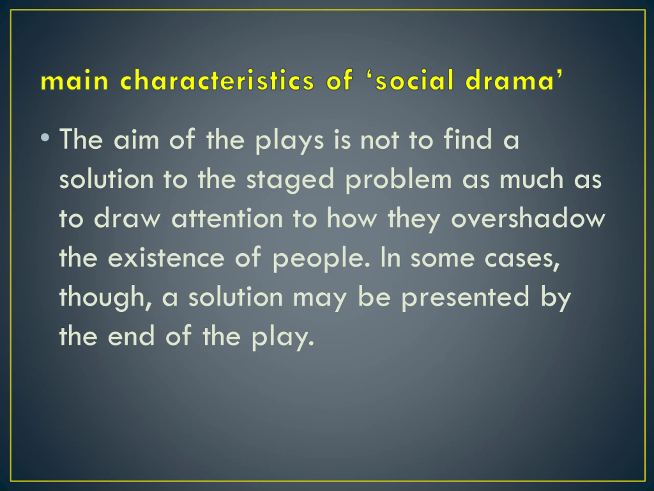 main characteristics of social drama The aim of the plays is not to find a solution to the staged problem as much as to draw attention to how they overshadow the existence of people. In some cases, though, a solution may be presented by the end of the play.