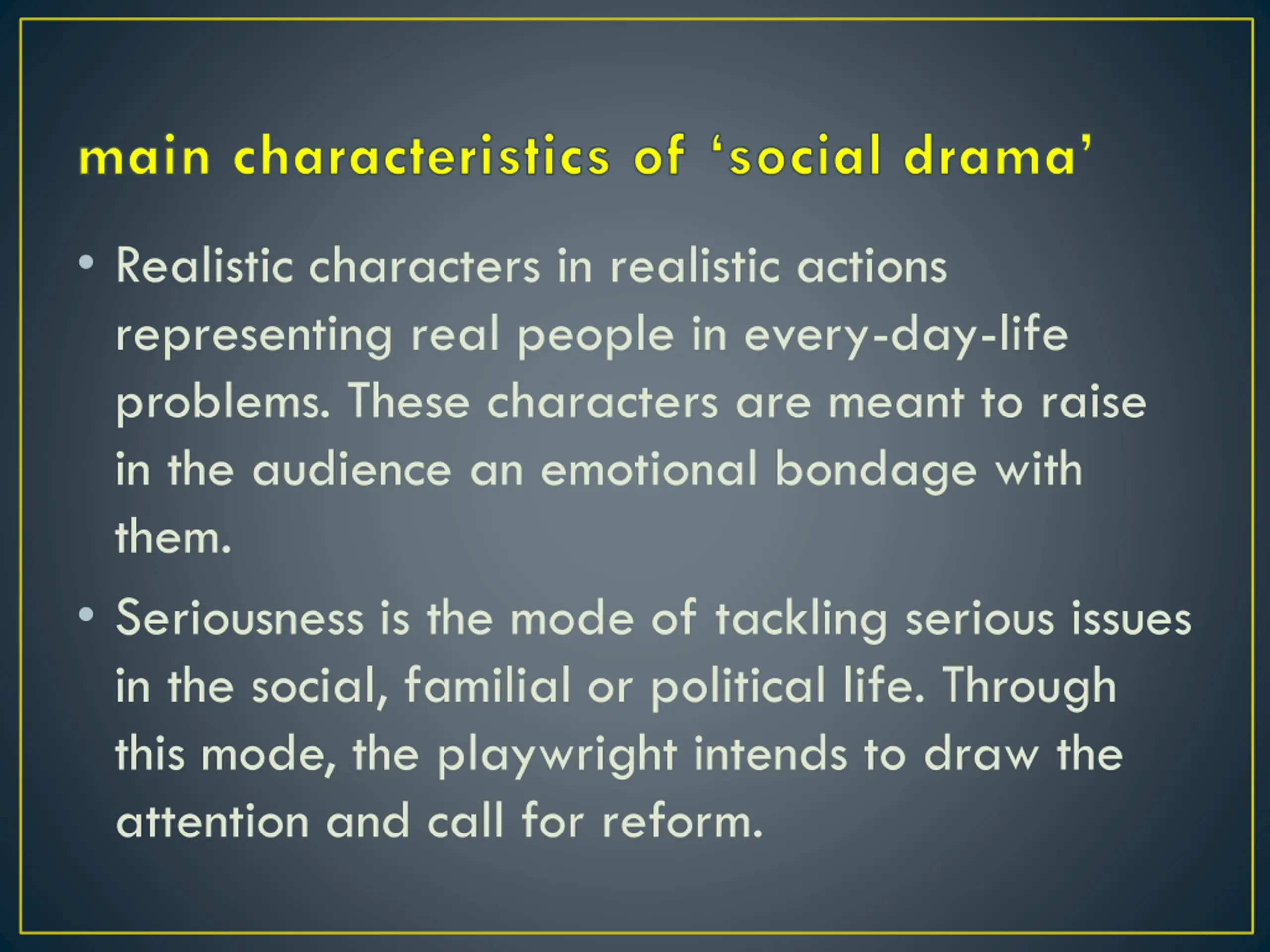 main characteristics of social drama Realistic characters in realistic actions representing real people in every-day-life problems. These characters are meant to raise in the audience an emotional bondage with them. Seriousness is the mode of tackling serious issues in the social, familial or political life. Through this mode, the playwright intends to draw the attention and call for reform.