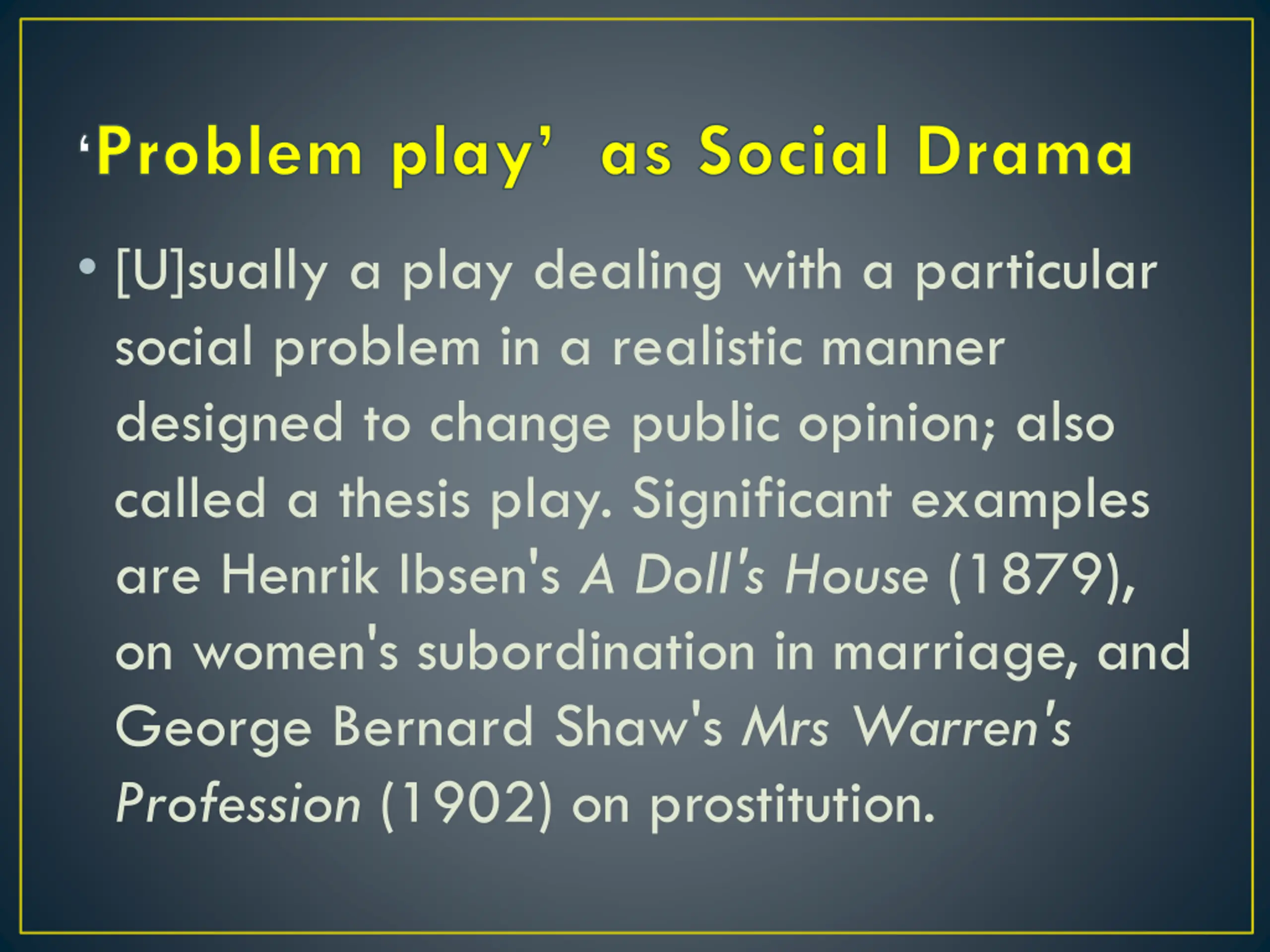 Problem play as Social Drama [U]sually a play dealing with a particular social problem in a realistic manner designed to change public opinion; also called a thesis play. Significant examples are Henrik Ibsen's A Doll's House (1879), on women's subordination in marriage, and George Bernard Shaw's Mrs Warren's Profession (1902) on prostitution.
