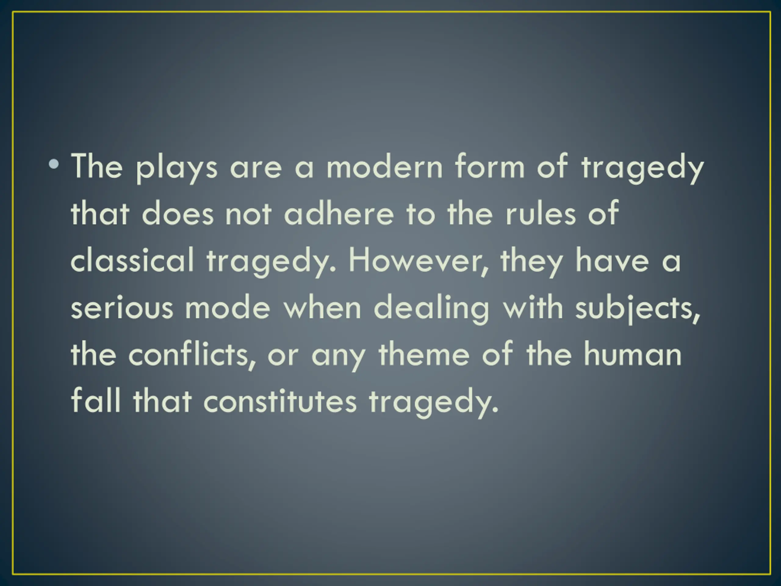 The plays are a modern form of tragedy that does not adhere to the rules of classical tragedy. However, they have a serious mode when dealing with subjects, the conflicts, or any theme of the human fall that constitutes tragedy.