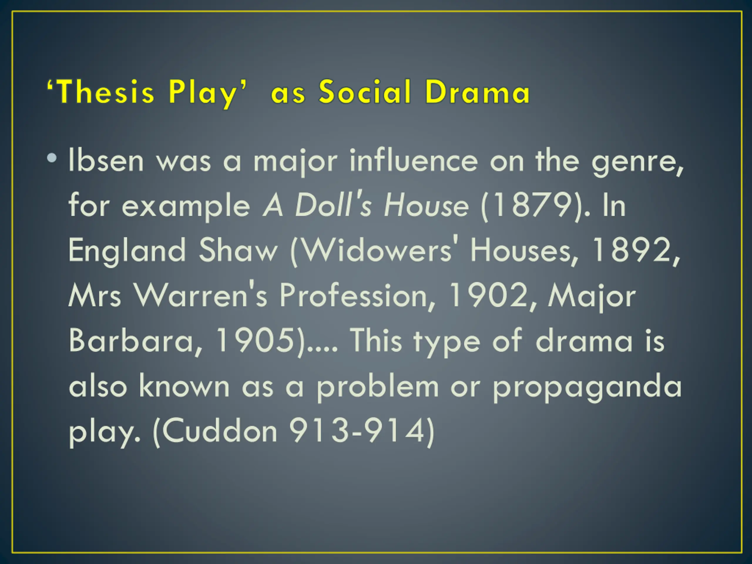 Thesis Play as Social Drama Ibsen was a major influence on the genre, for example A Doll's House (1879). In England Shaw (Widowers' Houses, 1892, Mrs Warren's Profession, 1902, Major Barbara, 1905).... This type of drama is also known as a problem or propaganda play. (Cuddon 913-914)