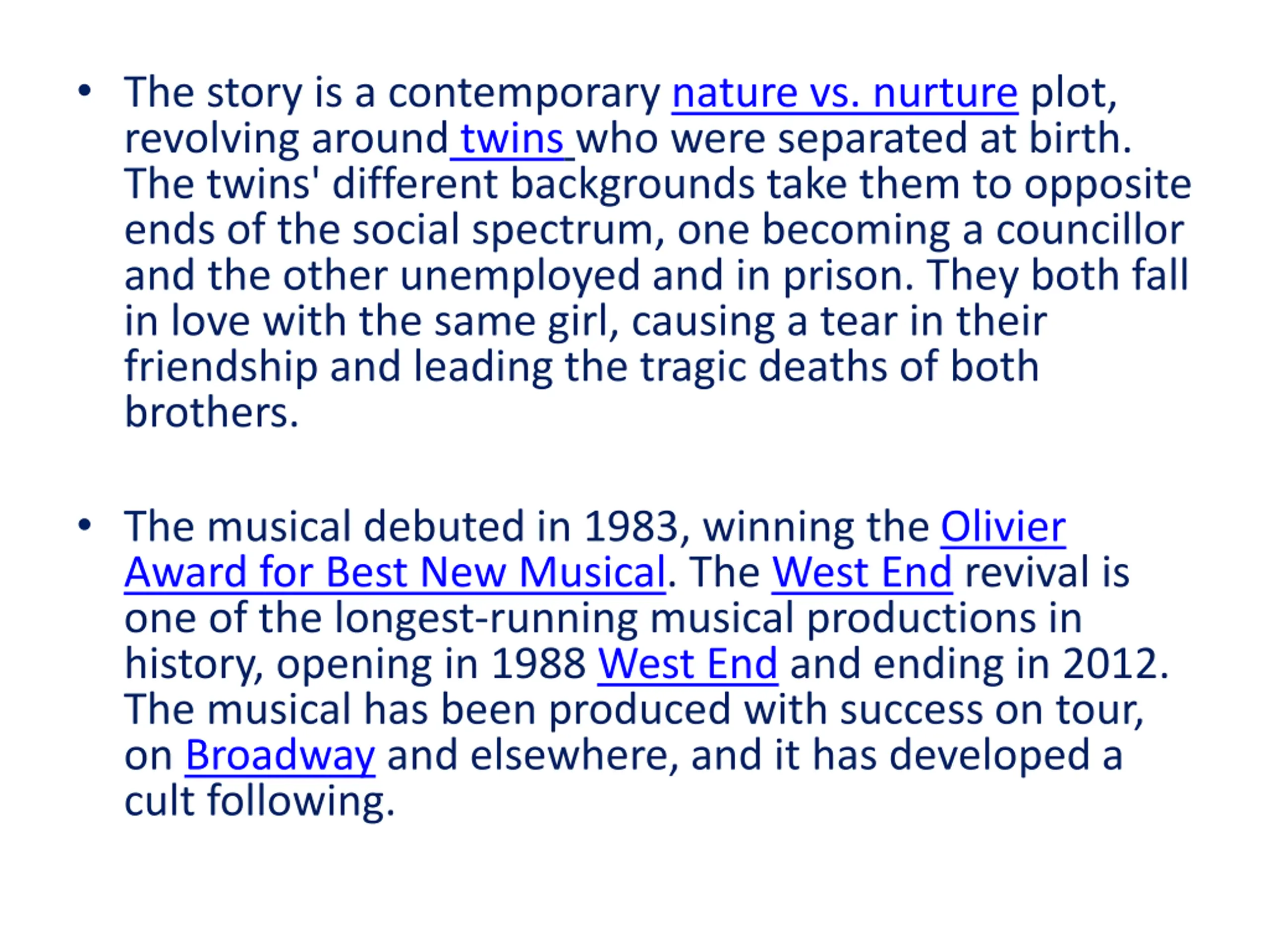 The story is a contemporary nature vs. nurture plot, revolving around twins who were separated at birth. The twins' different backgrounds take them to opposite ends of the social spectrum, one becoming a councillor and the other unemployed and in prison. They both fall in love with the same girl, causing a tear in their friendship and leading the tragic deaths of both brothers. The musical debuted in 1983, winning the Olivier Award for Best New Musical. The West End revival is one of the longest-running musical productions in history, opening in 1988 West End and ending in 2012. The musical has been produced with success on tour, on Broadway and elsewhere, and it has developed a cult following.