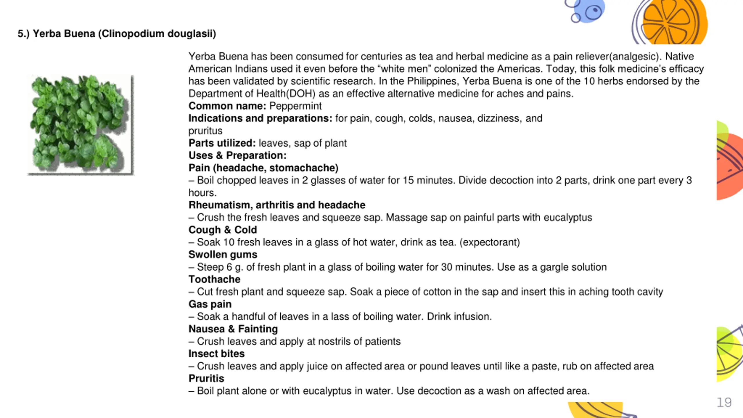 5.) Yerba Buena (Clinopodium douglasii) Yerba Buena has been consumed for centuries as tea and herbal medicine as a pain reliever(analgesic). Native American Indians used it even before the white men colonized the Americas. Today, this folk medicine s efficacy has been validated by scientific research. In the Philippines, Yerba Buena is one of the 10 herbs endorsed by the Department of Health(DOH) as an effective alternative medicine for aches and pains. Common name: Peppermint Indications and preparations: for pain, cough, colds, nausea, dizziness, and pruritus Parts utilized: leaves, sap of plant Uses & Preparation: Pain (headache, stomachache) Boil chopped leaves in 2 glasses of water for 15 minutes. Divide decoction into 2 parts, drink one part every 3 hours. Rheumatism, arthritis and headache Crush the fresh leaves and squeeze sap. Massage sap on painful parts with eucalyptus Cough & Cold Soak 10 fresh leaves in a glass of hot water, drink as tea. (expectorant) Swollen gums Steep 6 g. of fresh plant in a glass of boiling water for 30 minutes. Use as a gargle solution Toothache Cut fresh plant and squeeze sap. Soak a piece of cotton in the sap and insert this in aching tooth cavity Gas pain Soak a handful of leaves in a lass of boiling water. Drink infusion. Nausea & Fainting Crush leaves and apply at nostrils of patients Insect bites Crush leaves and apply juice on affected area or pound leaves until like a paste, rub on affected area Pruritis Boil plant alone or with eucalyptus in water. Use decoction as a wash on affected area. Yerba Buena (Clinopodium douglasii) 19