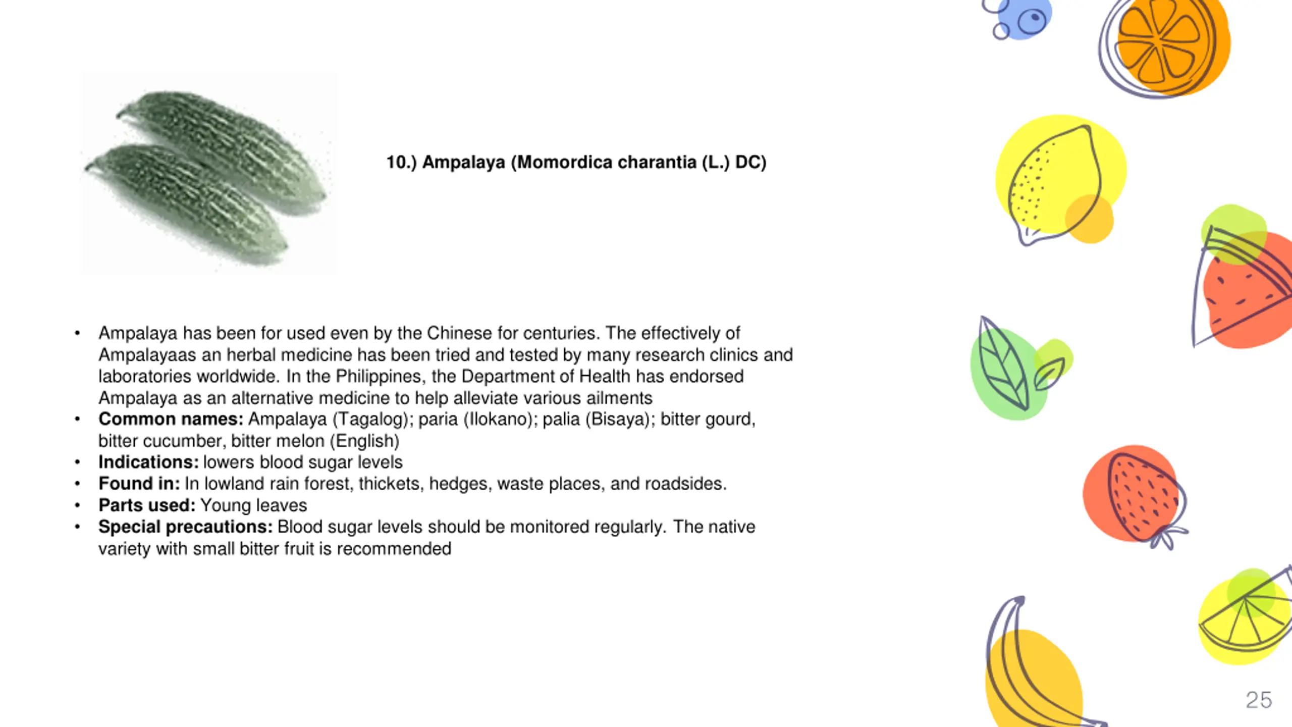 Ampalaya (Momordica charantia (L.) DC) 10.) Ampalaya (Momordica charantia (L.) DC) Ampalaya has been for used even by the Chinese for centuries. The effectively of Ampalayaas an herbal medicine has been tried and tested by many research clinics and laboratories worldwide. In the Philippines, the Department of Health has endorsed Ampalaya as an alternative medicine to help alleviate various ailments Common names: Ampalaya (Tagalog); paria (Ilokano); palia (Bisaya); bitter gourd, bitter cucumber, bitter melon (English) Indications: lowers blood sugar levels Found in: In lowland rain forest, thickets, hedges, waste places, and roadsides. Parts used: Young leaves Special precautions: Blood sugar levels should be monitored regularly. The native variety with small bitter fruit is recommended 25