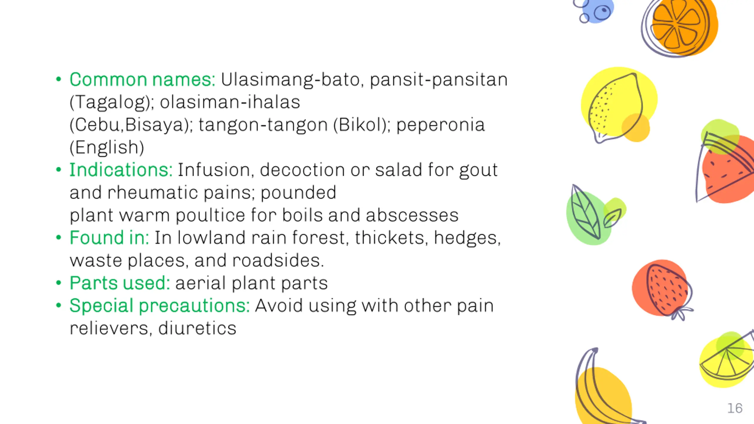 Common names: Common names: Ulasimang-bato, pansit-pansitan (Tagalog); olasiman-ihalas (Cebu,Bisaya); tangon-tangon (Bikol); peperonia (English) Indications: Indications: Infusion, decoction or salad for gout and rheumatic pains; pounded plant warm poultice for boils and abscesses Found in: Found in: In lowland rain forest, thickets, hedges, waste places, and roadsides. Parts used: Parts used: aerial plant parts Special precautions: Special precautions: Avoid using with other pain relievers, diuretics 16