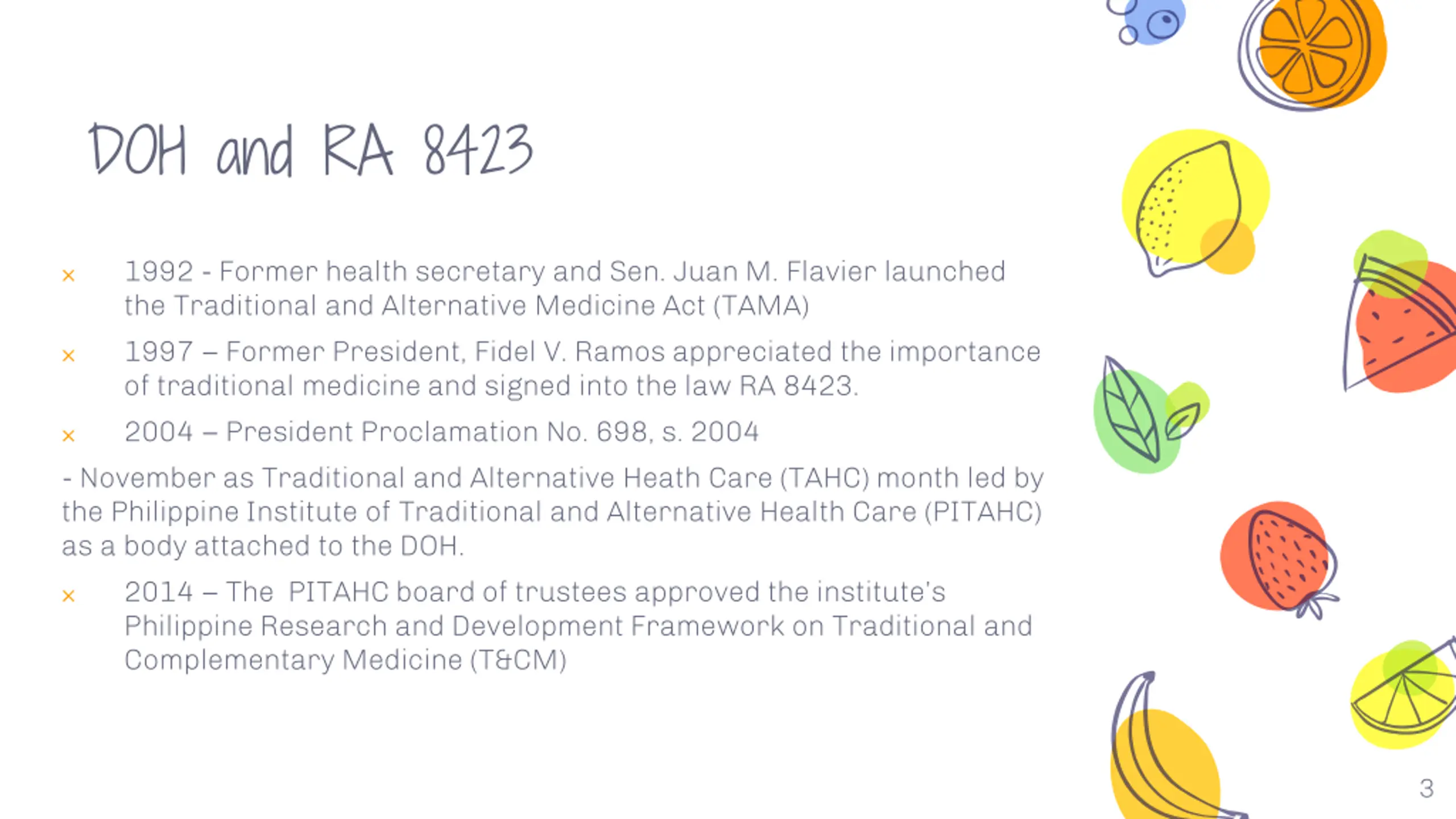 DOH and RA 8423 1992 - Former health secretary and Sen. Juan M. Flavier launched the Traditional and Alternative Medicine Act (TAMA) 1997 Former President, Fidel V. Ramos appreciated the importance of traditional medicine and signed into the law RA 8423. 2004 President Proclamation No. 698, s. 2004 - November as Traditional and Alternative Heath Care (TAHC) month led by the Philippine Institute of Traditional and Alternative Health Care (PITAHC) as a body attached to the DOH. Philippine Research and Development Framework on Traditional and Complementary Medicine (T&CM) 2014 The PITAHC board of trustees approved the institute s 3