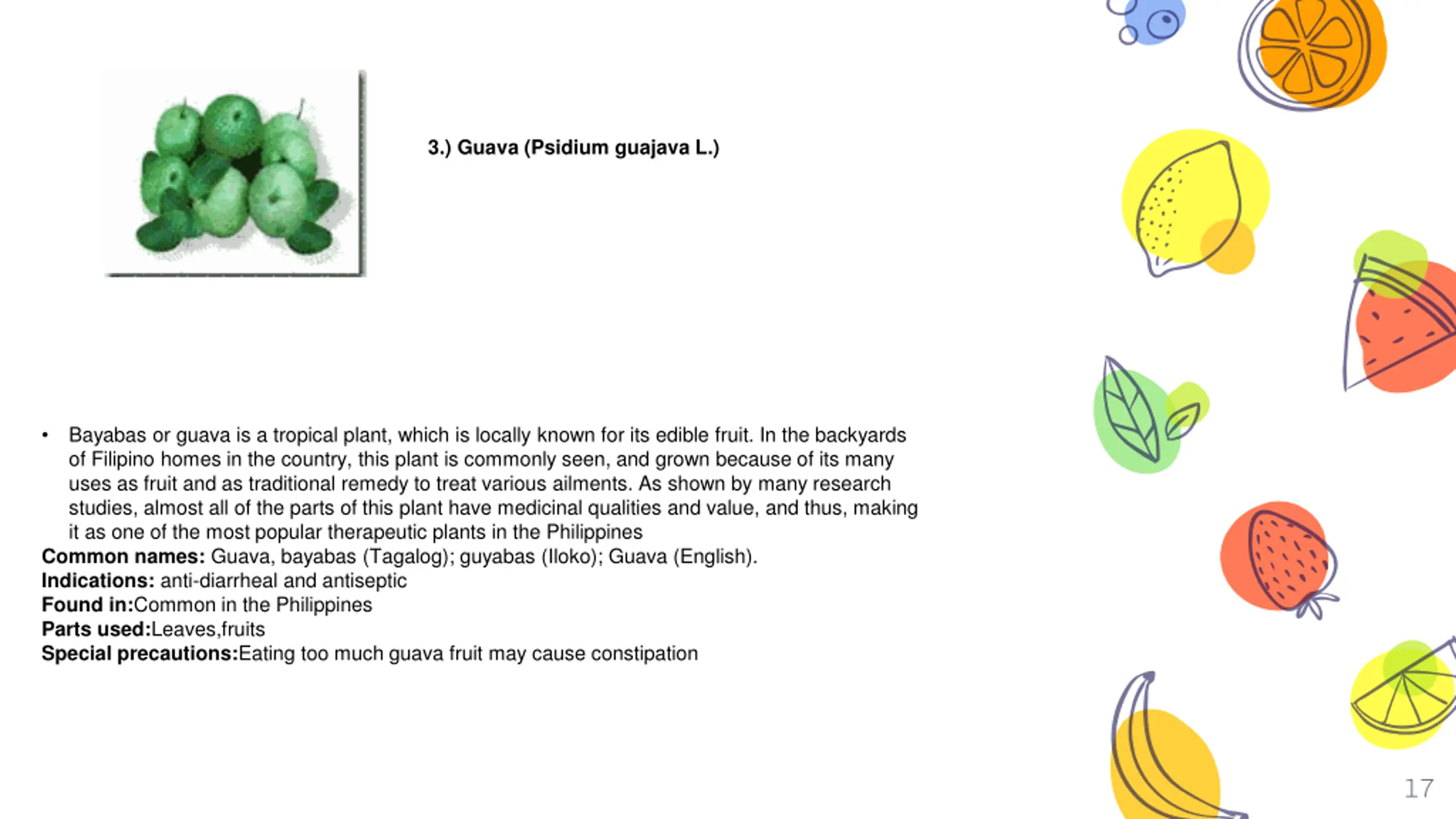 Guava (Psidium guajava L.) 3.) Guava (Psidium guajava L.) Bayabas or guava is a tropical plant, which is locally known for its edible fruit. In the backyards of Filipino homes in the country, this plant is commonly seen, and grown because of its many uses as fruit and as traditional remedy to treat various ailments. As shown by many research studies, almost all of the parts of this plant have medicinal qualities and value, and thus, making it as one of the most popular therapeutic plants in the Philippines Common names: Guava, bayabas (Tagalog); guyabas (Iloko); Guava (English). Indications: anti-diarrheal and antiseptic Found in:Common in the Philippines Parts used:Leaves,fruits Special precautions:Eating too much guava fruit may cause constipation 17