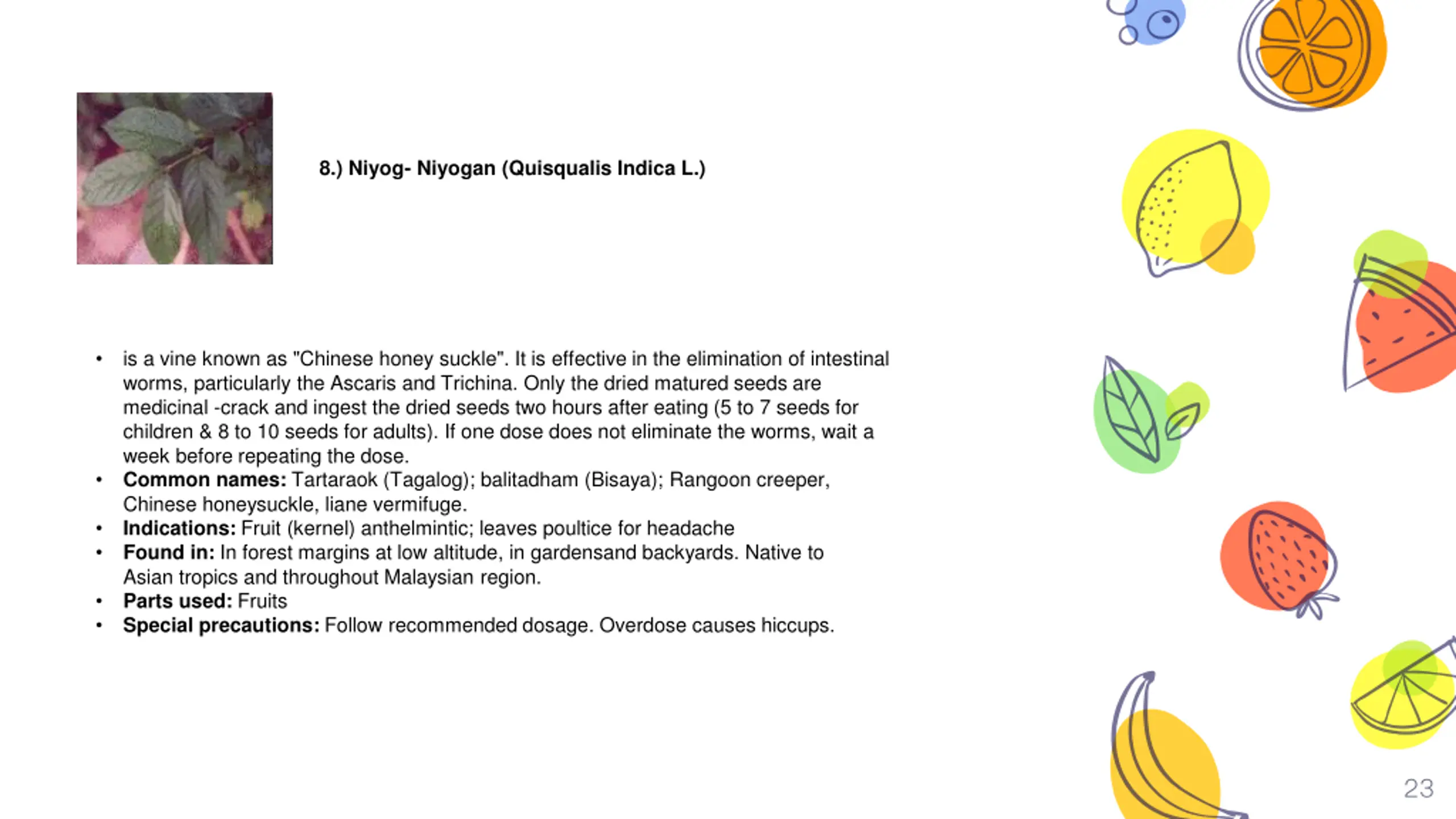 Niyog- Niyogan (Quisqualis Indica L.) 8.) Niyog- Niyogan (Quisqualis Indica L.) is a vine known as "Chinese honey suckle". It is effective in the elimination of intestinal worms, particularly the Ascaris and Trichina. Only the dried matured seeds are medicinal -crack and ingest the dried seeds two hours after eating (5 to 7 seeds for children & 8 to 10 seeds for adults). If one dose does not eliminate the worms, wait a week before repeating the dose. Common names: Tartaraok (Tagalog); balitadham (Bisaya); Rangoon creeper, Chinese honeysuckle, liane vermifuge. Indications: Fruit (kernel) anthelmintic; leaves poultice for headache Found in: In forest margins at low altitude, in gardensand backyards. Native to Asian tropics and throughout Malaysian region. Parts used: Fruits Special precautions: Follow recommended dosage. Overdose causes hiccups. 23