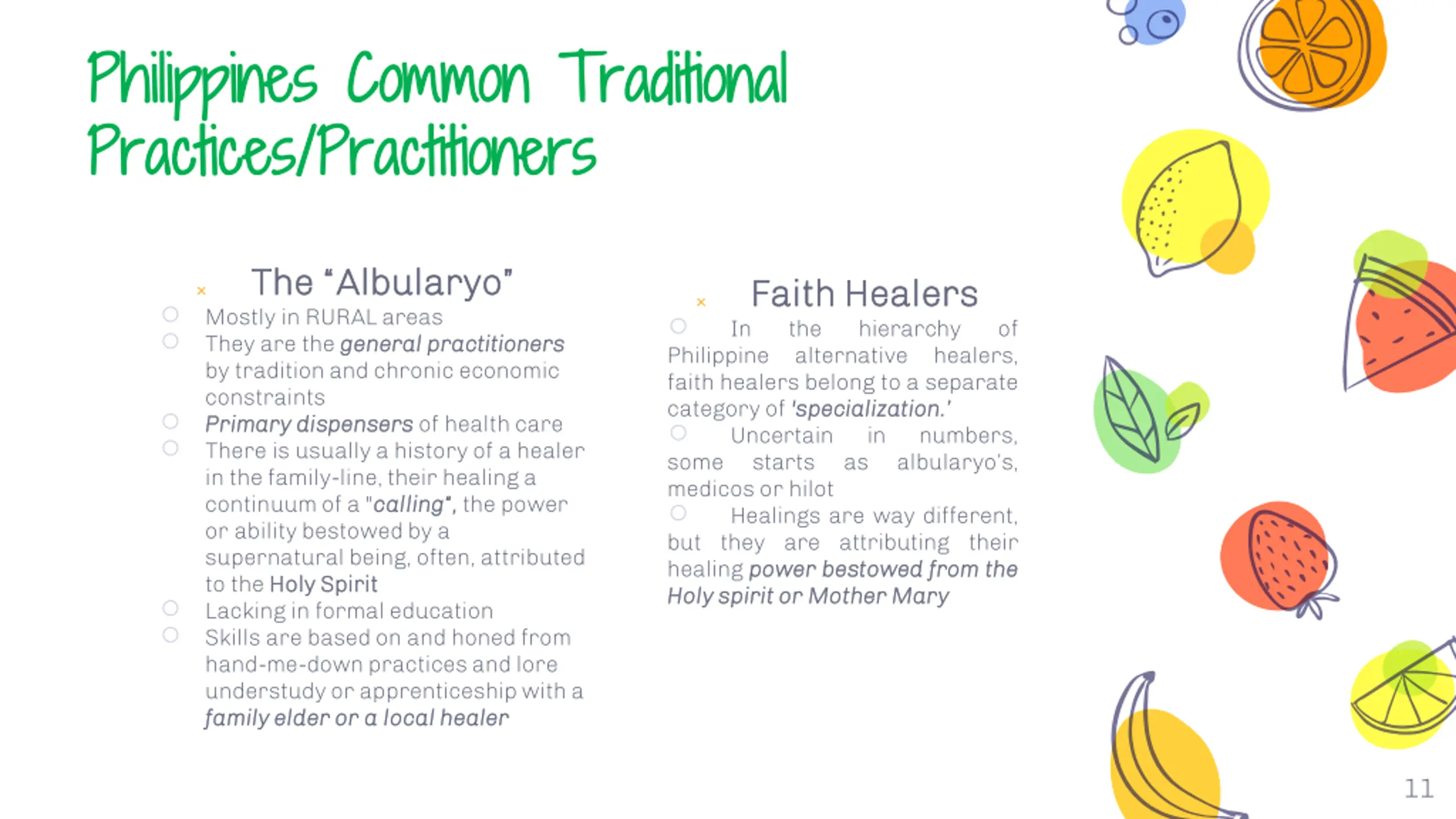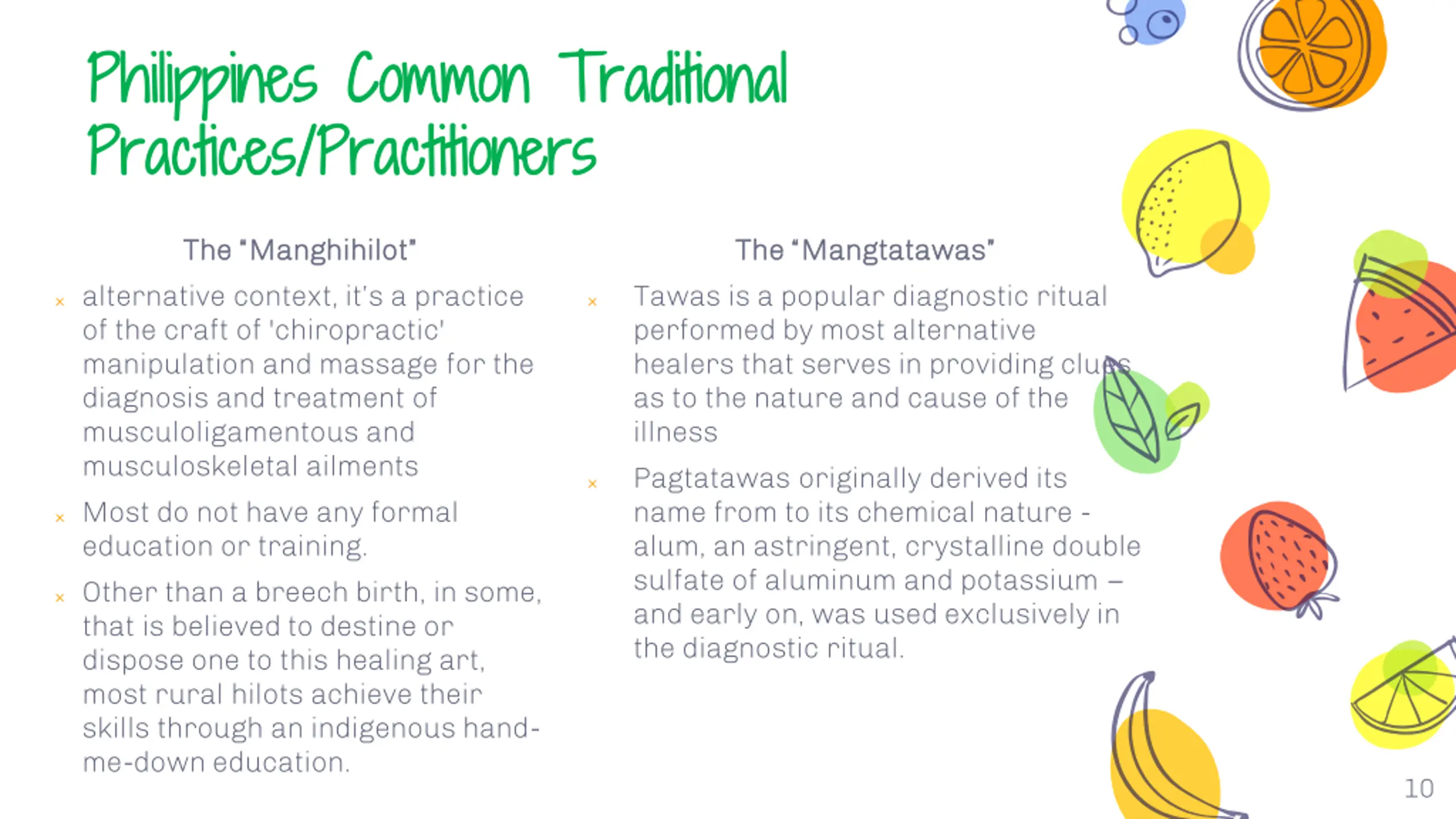 Philippines Common Traditional Philippines Common Traditional Practices/Practitioners Practices/Practitioners The The Manghihilot Manghihilot The The Mangtatawas Mangtatawas Tawas is a popular diagnostic ritual performed by most alternative healers that serves in providing clues as to the nature and cause of the illness Pagtatawas originally derived its name from to its chemical nature - alum, an astringent, crystalline double sulfate of aluminum and potassium and early on, was used exclusively in the diagnostic ritual. alternative context, it s a practice of the craft of 'chiropractic' manipulation and massage for the diagnosis and treatment of musculoligamentous and musculoskeletal ailments Most do not have any formal education or training. Other than a breech birth, in some, that is believed to destine or dispose one to this healing art, most rural hilots achieve their skills through an indigenous hand- me-down education. 10