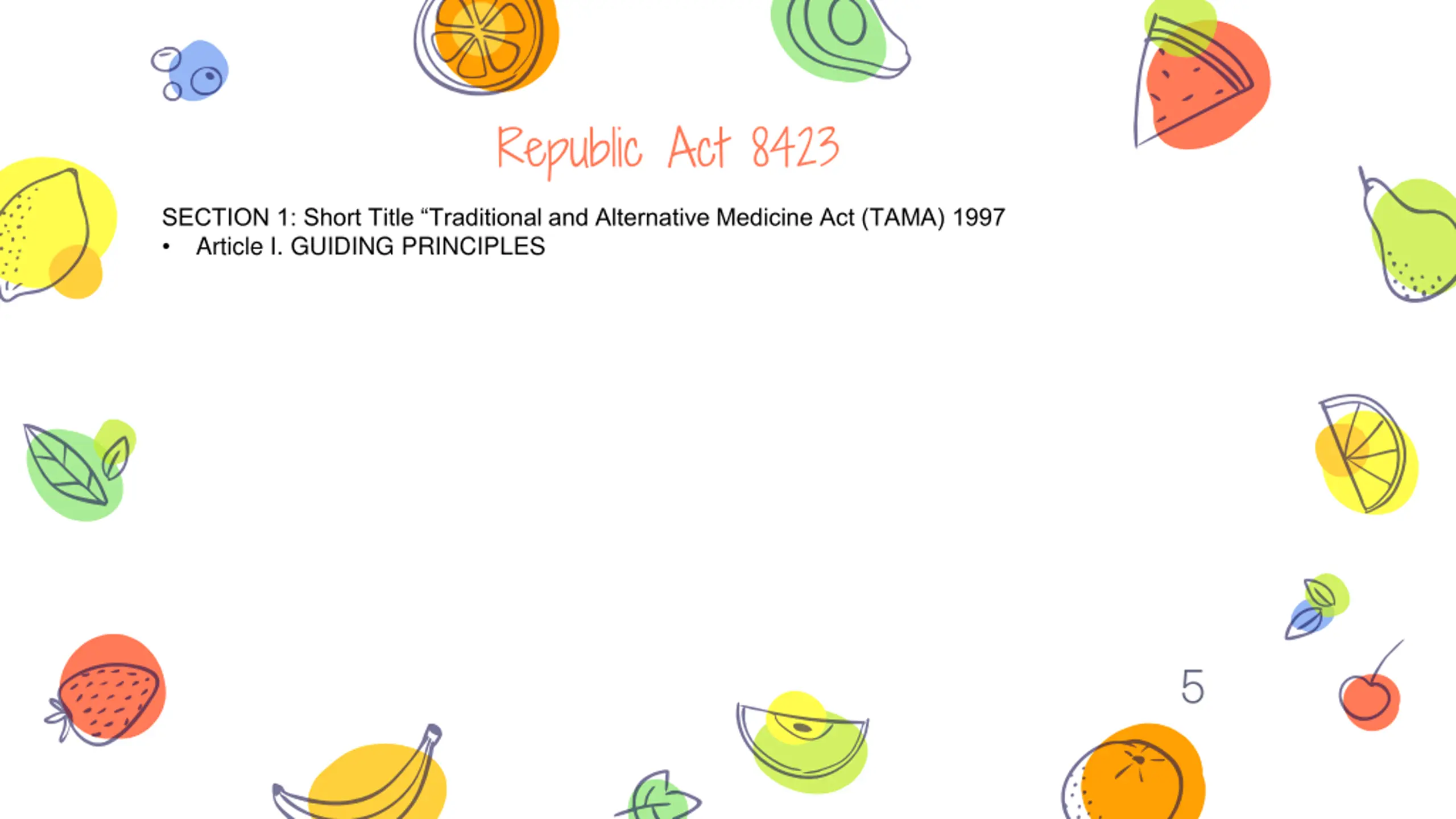 Republic Act 8423 SECTION 1: Short Title Traditional and Alternative Medicine Act (TAMA) 1997 Article I. GUIDING PRINCIPLES 4
